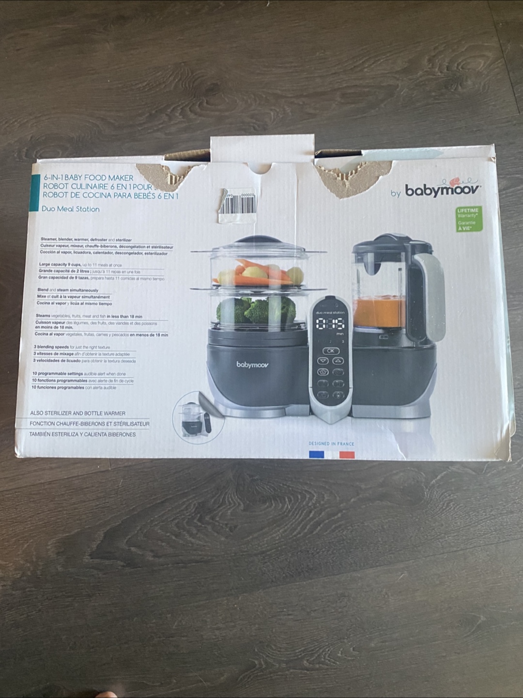 Babymoov Duo Meal Station. 6-in-1 baby food maker. Steams, blends, warms, defrosts, sterilizes. Includes various attachments. Designed in France.