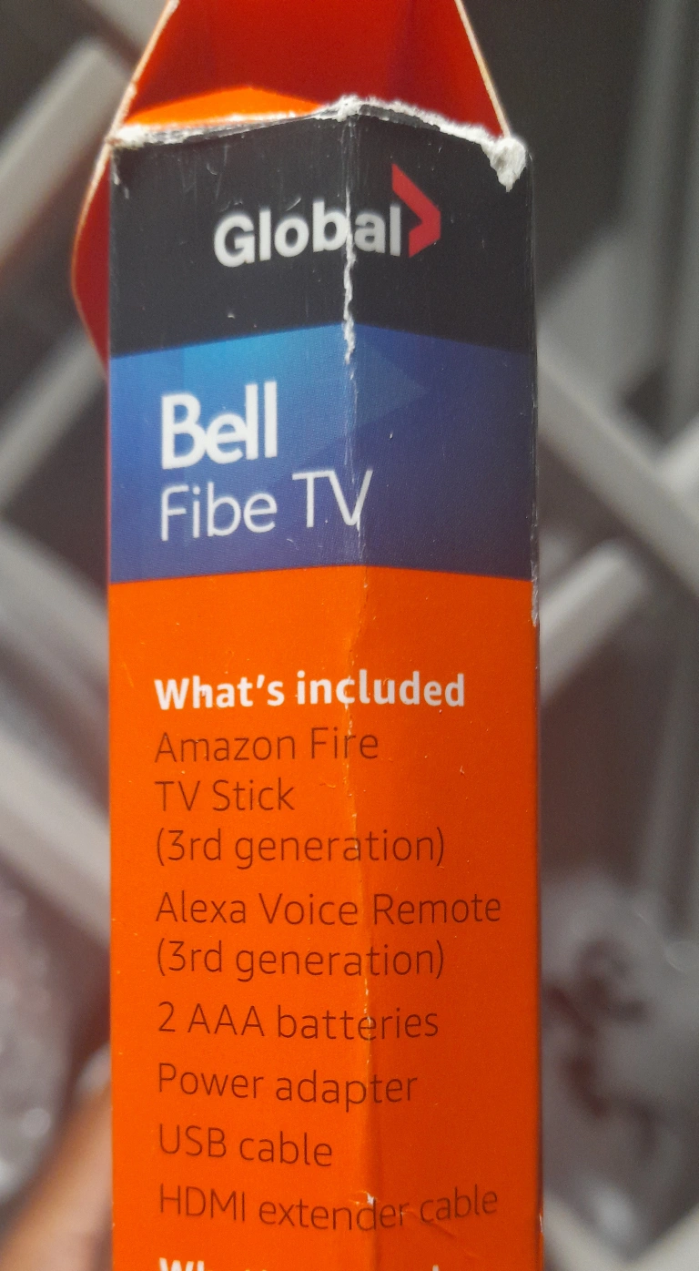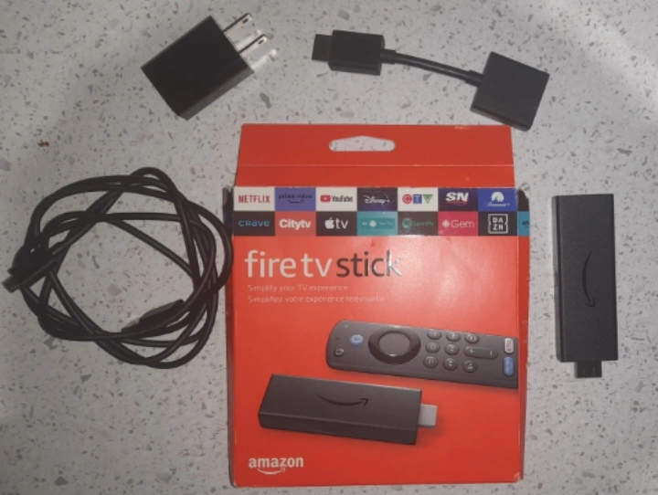Pre-owned Amazon Fire TV Stick, 3rd generation. Includes Alexa Voice Remote (batteries included in the remote), power adapter, USB cable, and HDMI extender cable. Great for streaming your favourite shows.