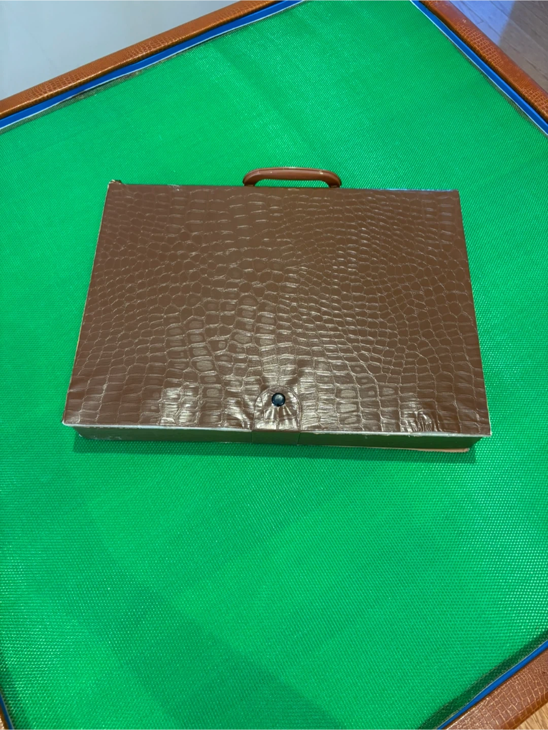 Mahjong set with tiles, dice, and chips included. The set comes in a folding case with a faux leather exterior.