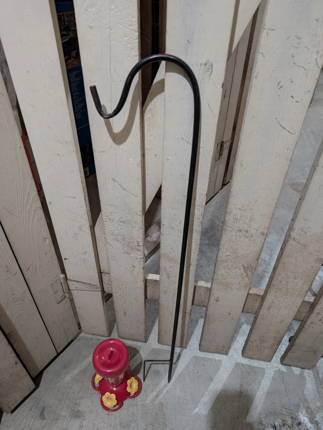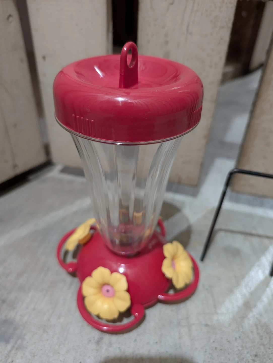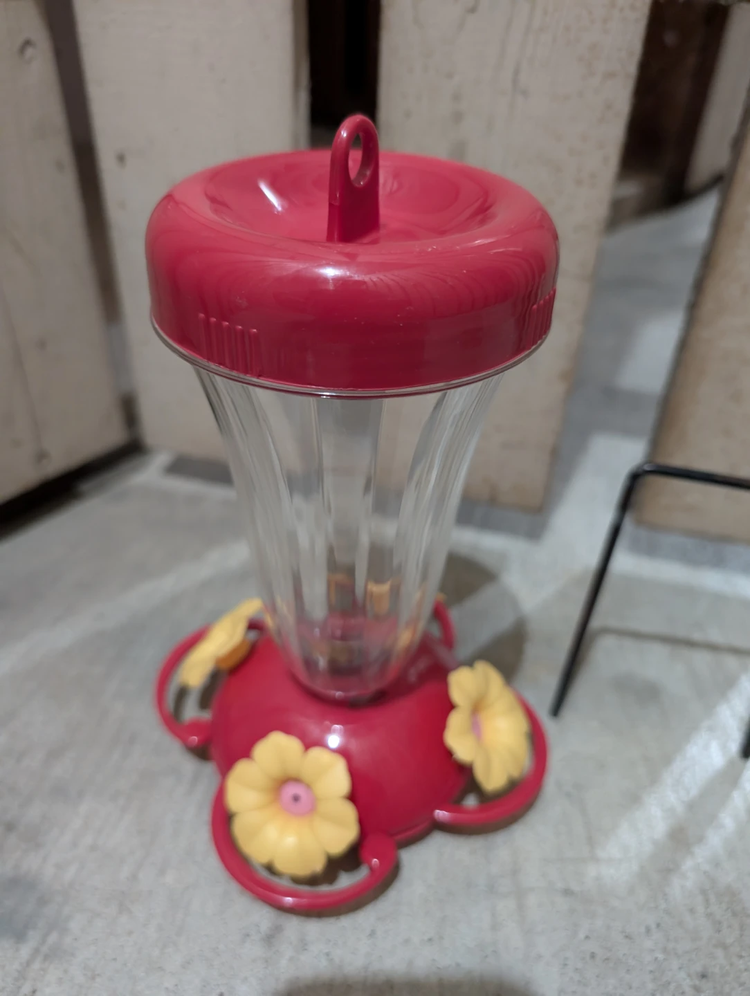 Perky-Pet hummingbird feeder with red and yellow flower accents. It's made of clear plastic and red plastic parts. Includes a bag of Perky-Pet Instant Nectar Concentrate. This feeder is great for attracting hummingbirds to your yard!