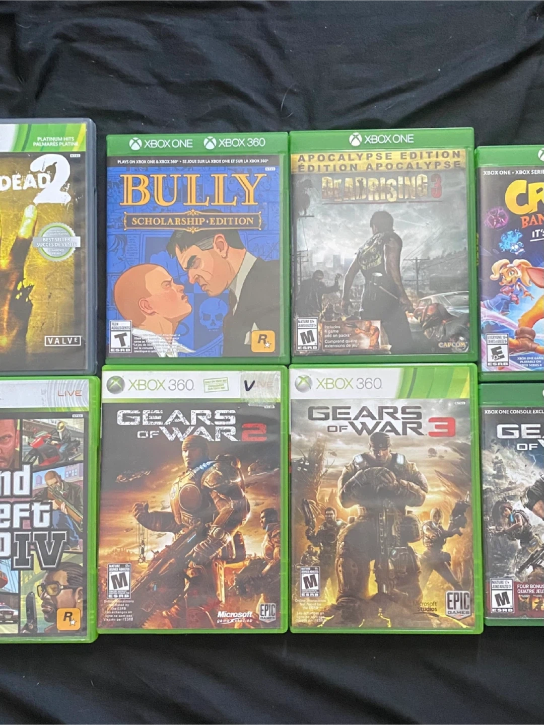 Selling a collection of Xbox video games. Includes Dead Rising 3 Apocalypse Edition, Bully Scholarship Edition, Gears of War 2, and Gears of War 3. All are for Xbox platforms. 15 each or 100 for all