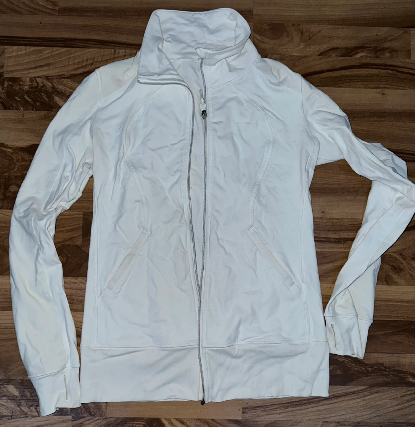 This is a white Lululemon zip-up jacket. It features a full zipper and two front pockets. The material is soft and breathable.