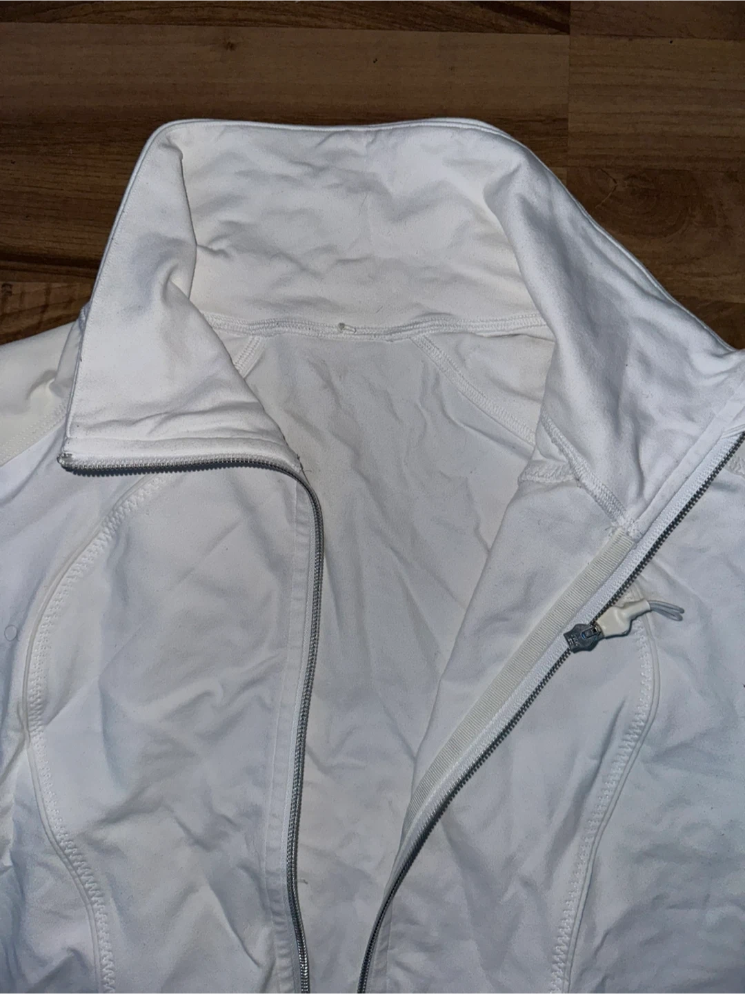 This is a white Lululemon zip-up jacket. It features a full zipper and two front pockets. The material is soft and breathable.