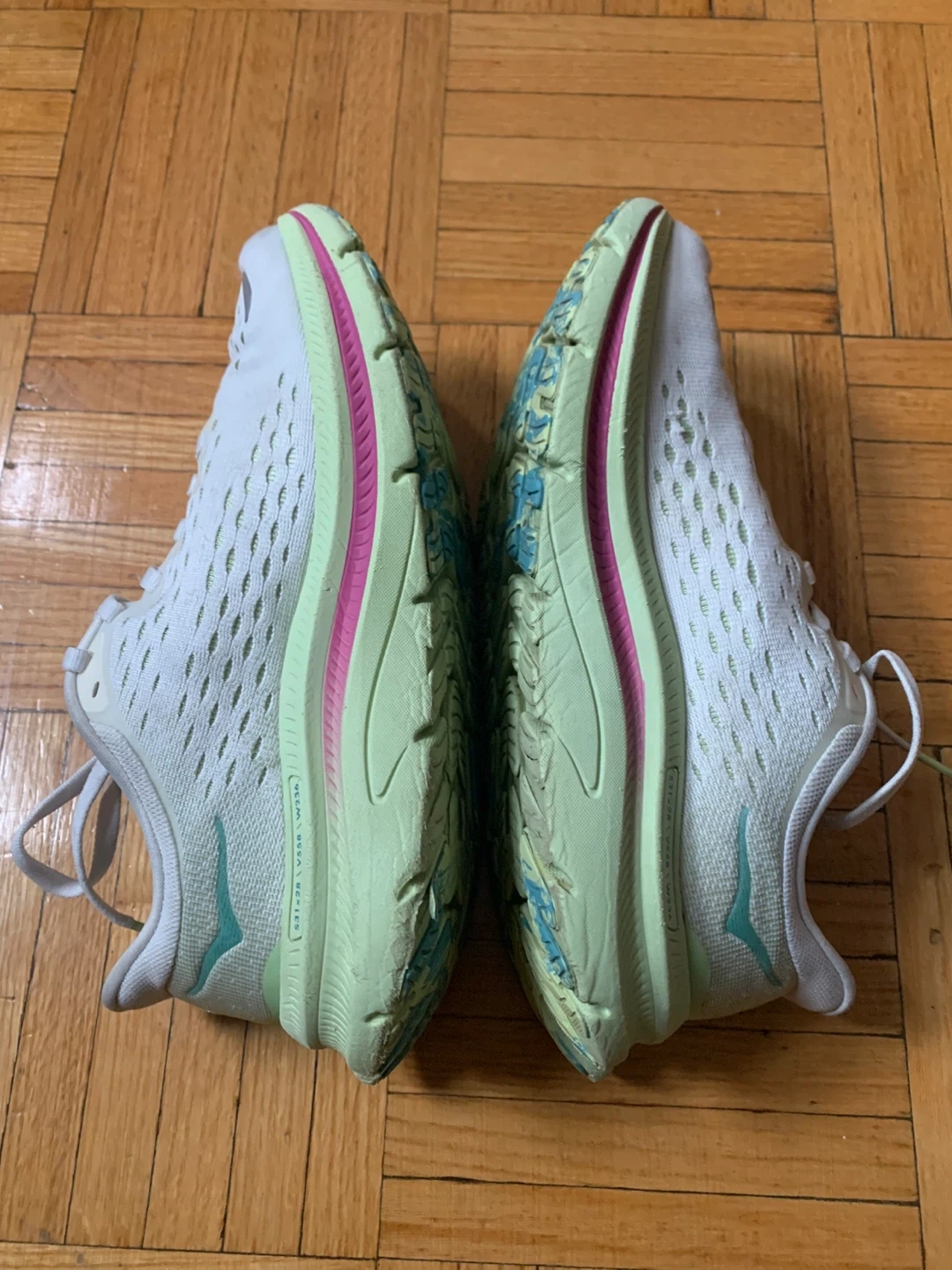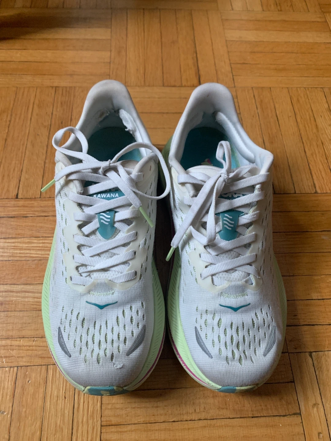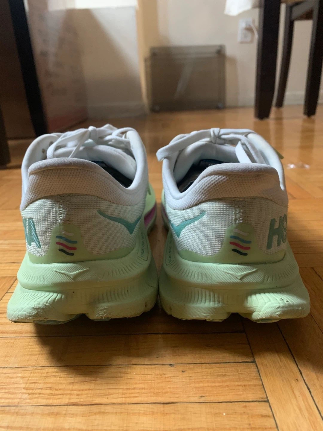 These Hoka running shoes are designed for comfort and performance. The white and light green colourway is stylish. They're perfect for hitting the pavement or the trail!