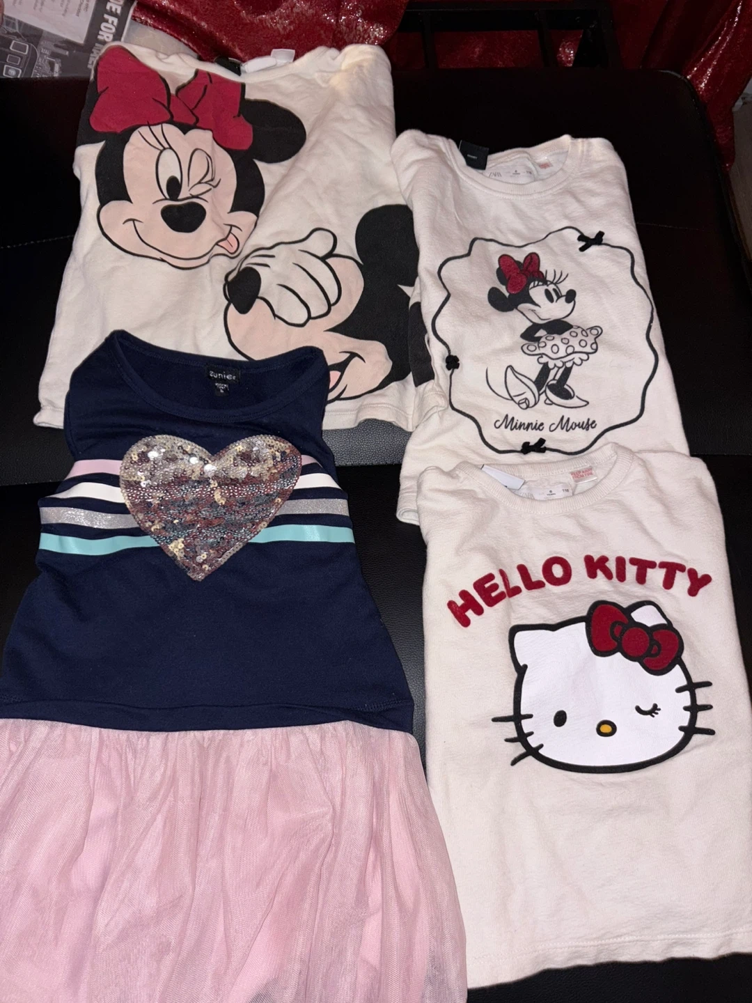 Bundle of girls' tops featuring Minnie Mouse and Hello Kitty designs. One top has a sequin heart detail and a pink tulle skirt. Perfect for little fans of these characters!