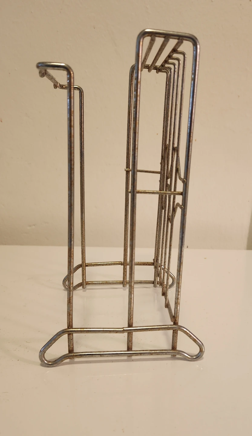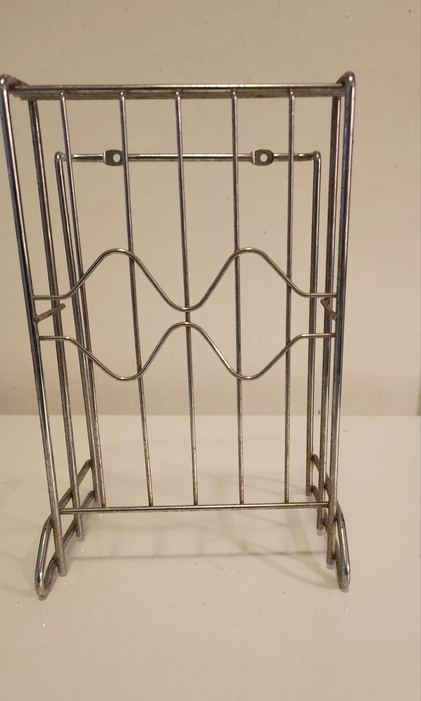 This is a metal magazine rack with a wire frame design. It's approximately 13 inches tall and 6 inches wide. Perfect for organizing your magazines or newspapers!