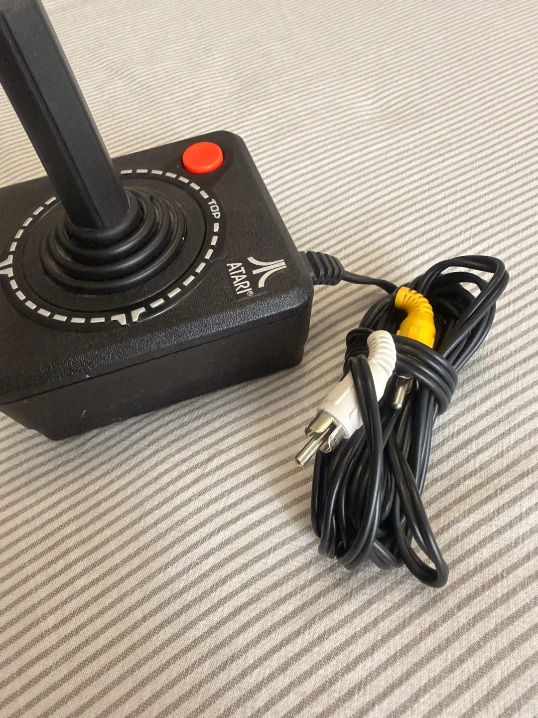 This is an Atari joystick controller. It's black with a red button on top and three red buttons on the front. Includes RCA cables.
