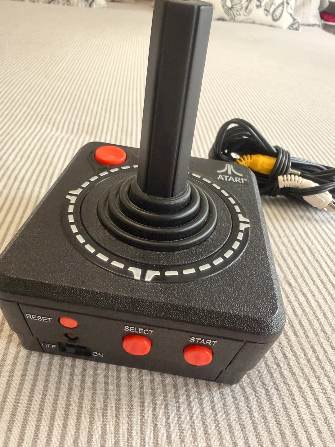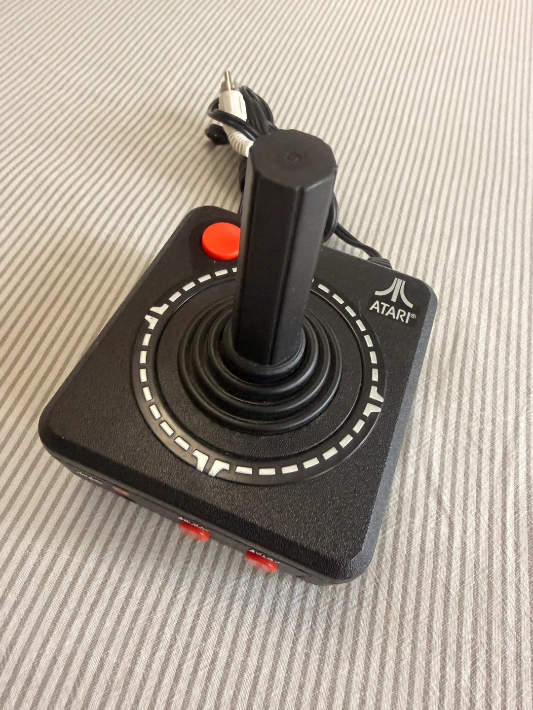This is an Atari joystick controller. It's black with a red button on top and three red buttons on the front. Includes RCA cables.