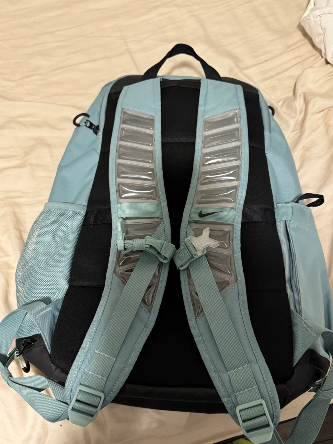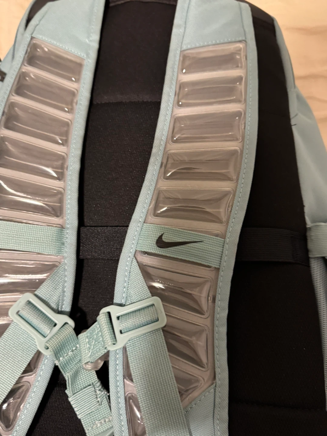 Light blue Nike Elite backpack. It's made of durable material with padded shoulder straps for comfort. Features multiple pockets and a mesh side pocket for water bottles. Great for sports or everyday use! Comes with all the zippers.