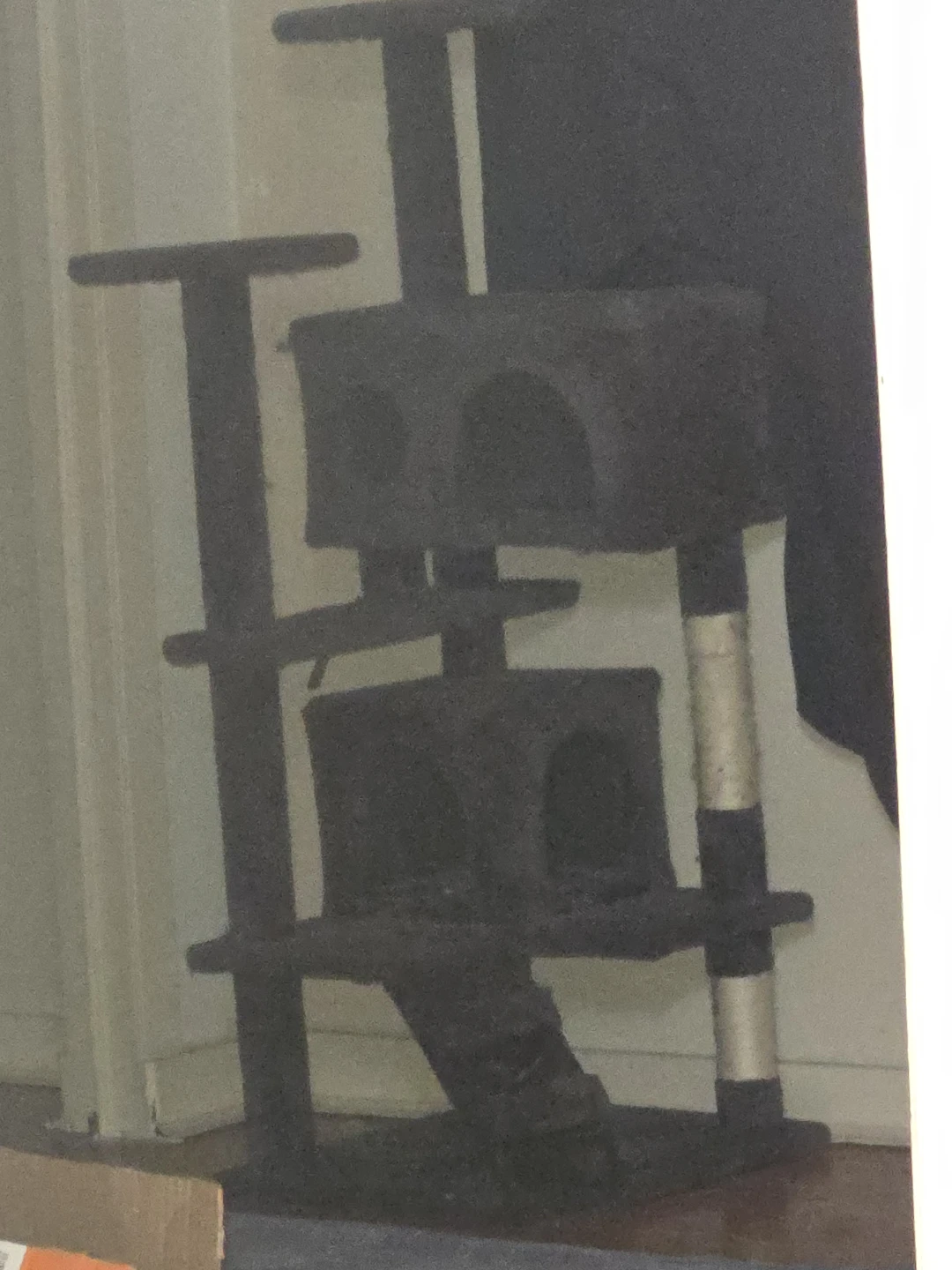I have 3 multi-level cat trees provides climbing and lounging spots for your feline friends. It's covered in soft, dark material for comfort. The sturdy construction includes scratching posts for claw maintenance.