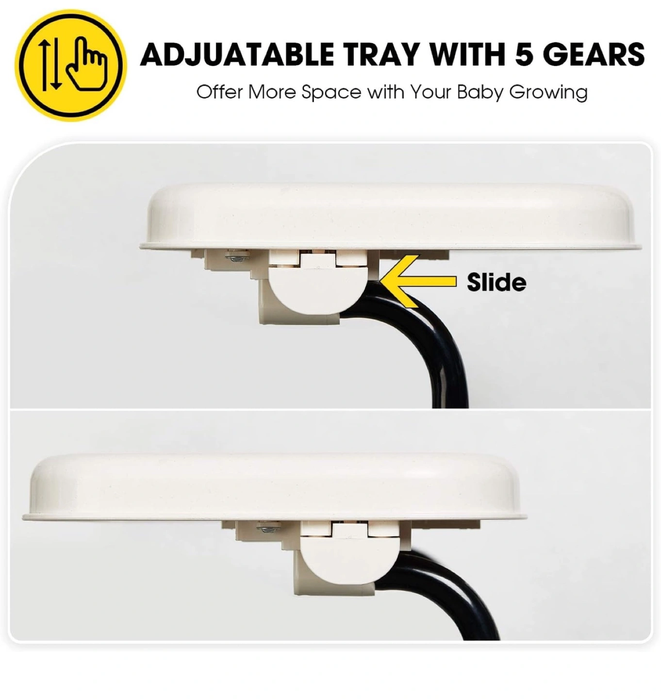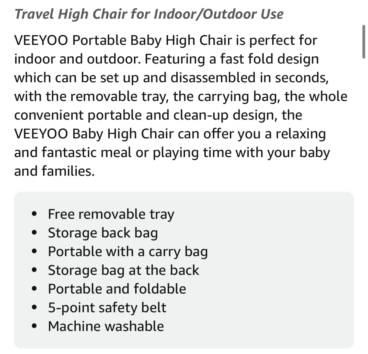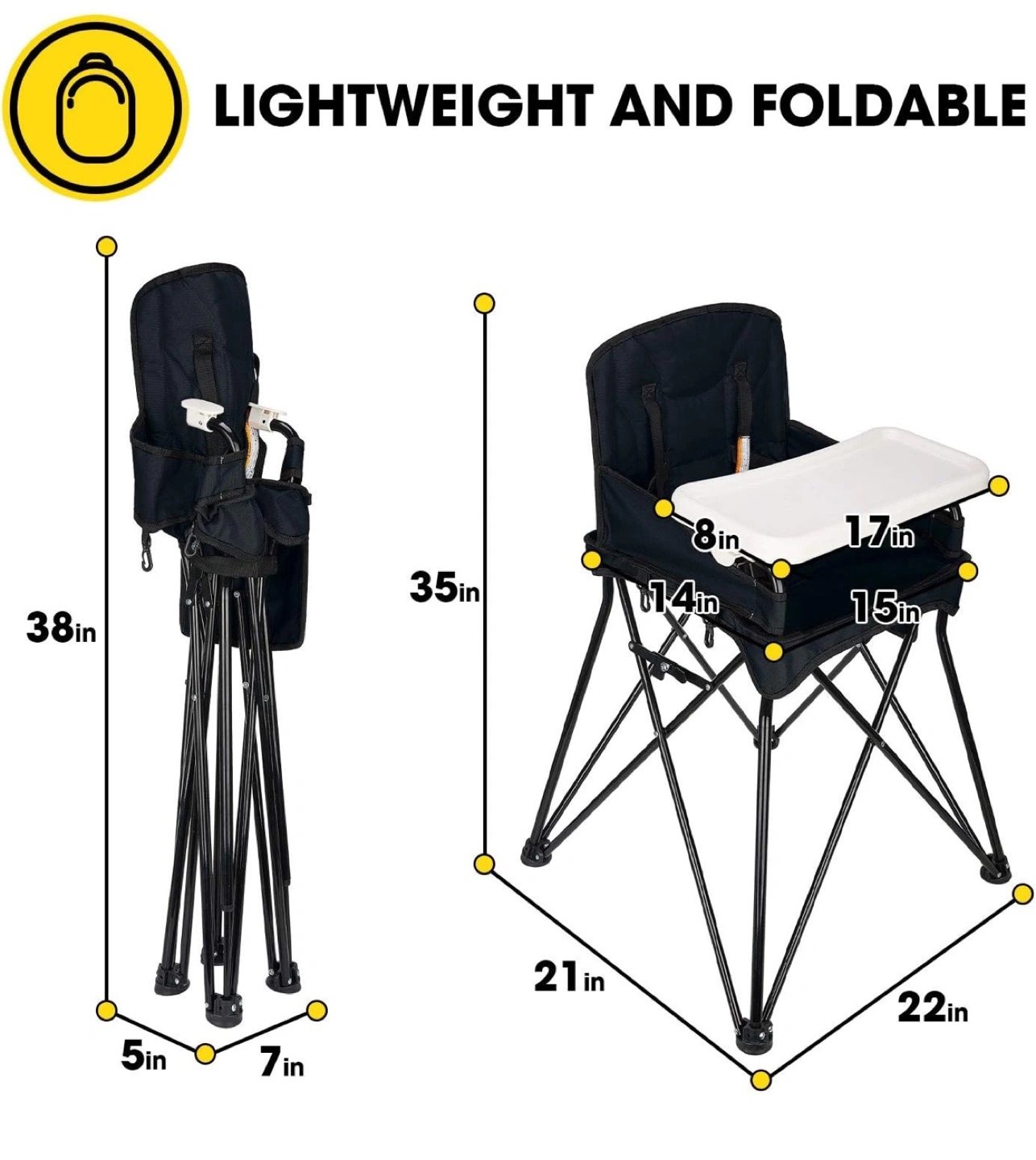 Foldable, adjustable high chair. Features a removable tray, storage bag and 5-point safety belt. Machine washable.