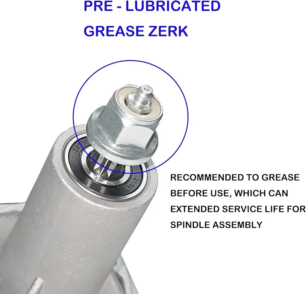 【Pre-Greased Design】The spindle is pre-greased, equipped with a grease fitting on the side of the spindle for maintenance. THE PRODUCT IS ONLY A LITTER GREASE. IT IS BETTER TO GREASE BEFORE USING IT AND UNTIL GREASE CAN BE SEEN COMING OUT OF THE WEEP HOLE AT THE BASE. Remember to change the oil when the lawn-mowing season is over. Changing oil is also crucial as it makes the mower last longer