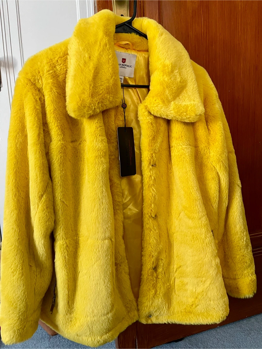Bright yellow faux fur jacket from Urban Republic. It's a size medium and features a comfortable, plush feel. This coat is perfect for adding a pop of color to any outfit! I never wear it its brand new.