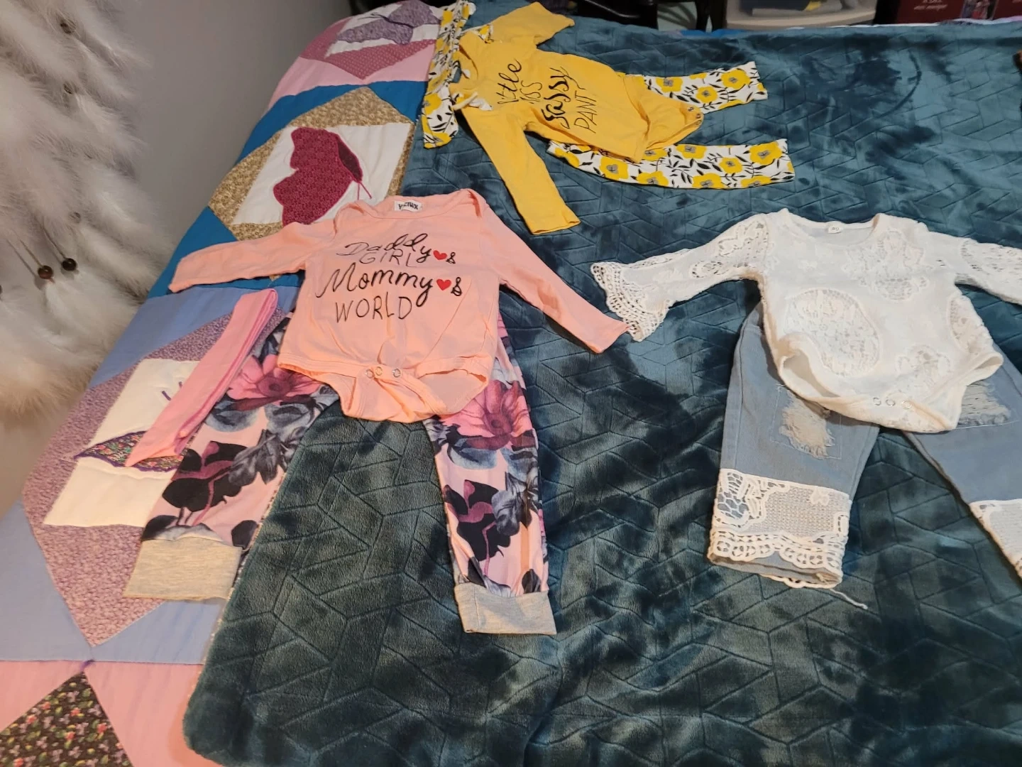 5 new Sets of baby girl outfits. Includes various tops and pants with cute sayings and patterns. One set has a white lace bodysuit with distressed denim pants. Another features a black long-sleeve bodysuit with leopard print accents and matching pants. Yellow and pink options also available. Great for everyday wear or special occasions!