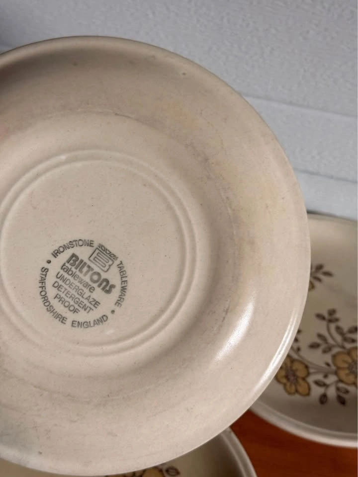 Vintage Biltons Ironstone dessert plates with a pretty floral pattern featuring yellow/gold flowers and brown leaves. Set of 5 plates. Underglaze and detergent proof. Asking $2 each.