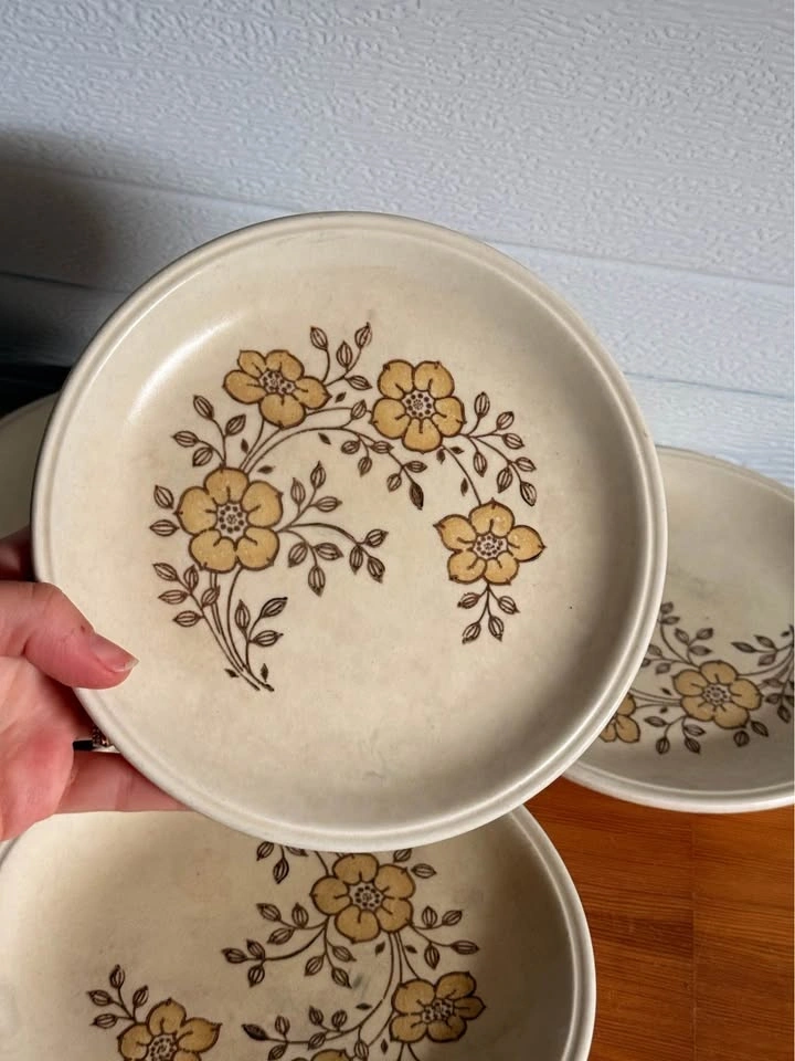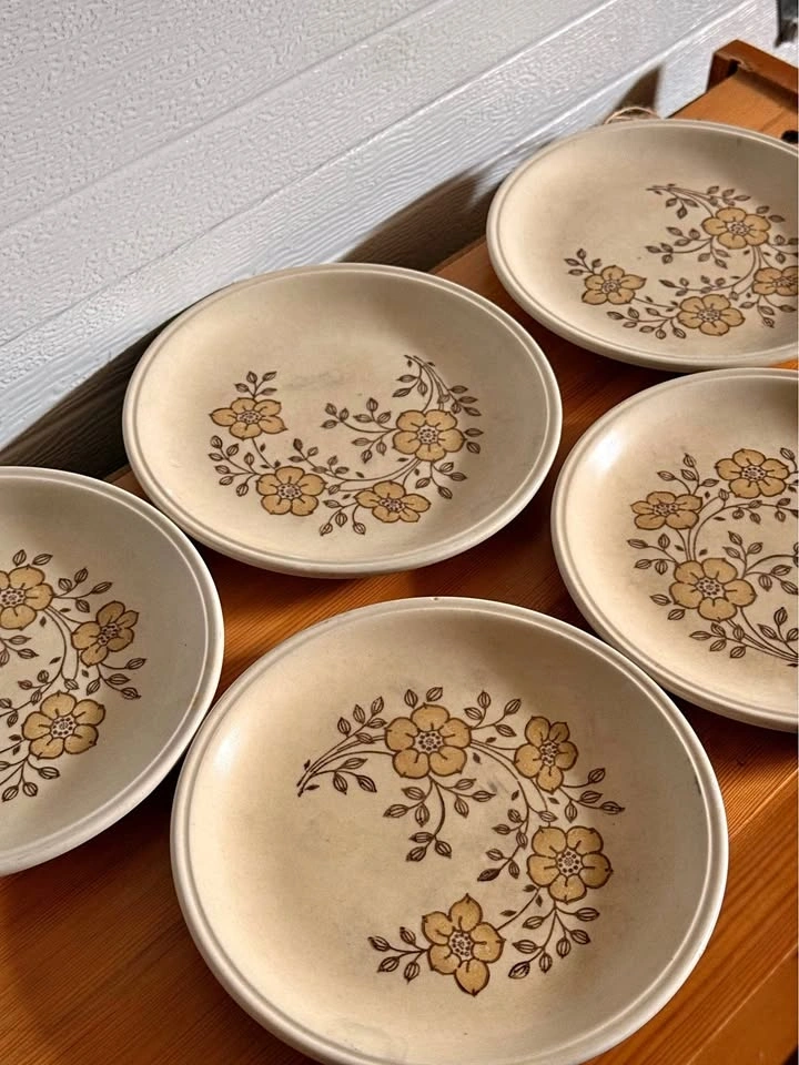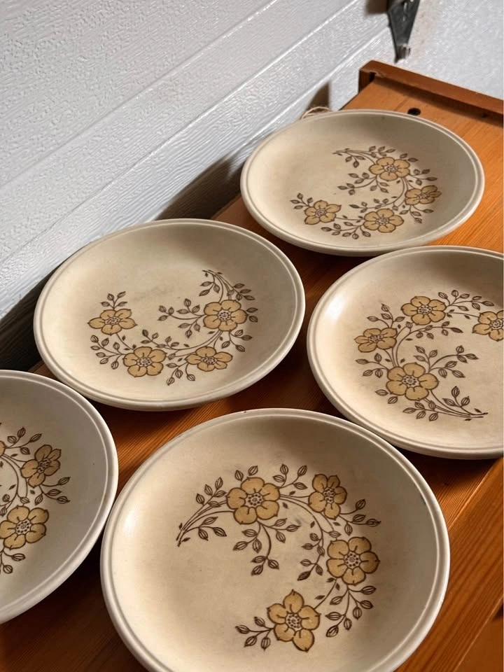 Vintage Biltons Ironstone dessert plates with a pretty floral pattern featuring yellow/gold flowers and brown leaves. Set of 5 plates. Underglaze and detergent proof. Asking $2 each.