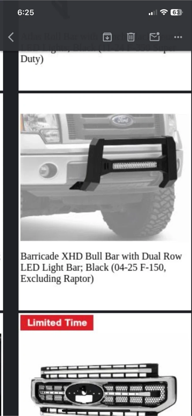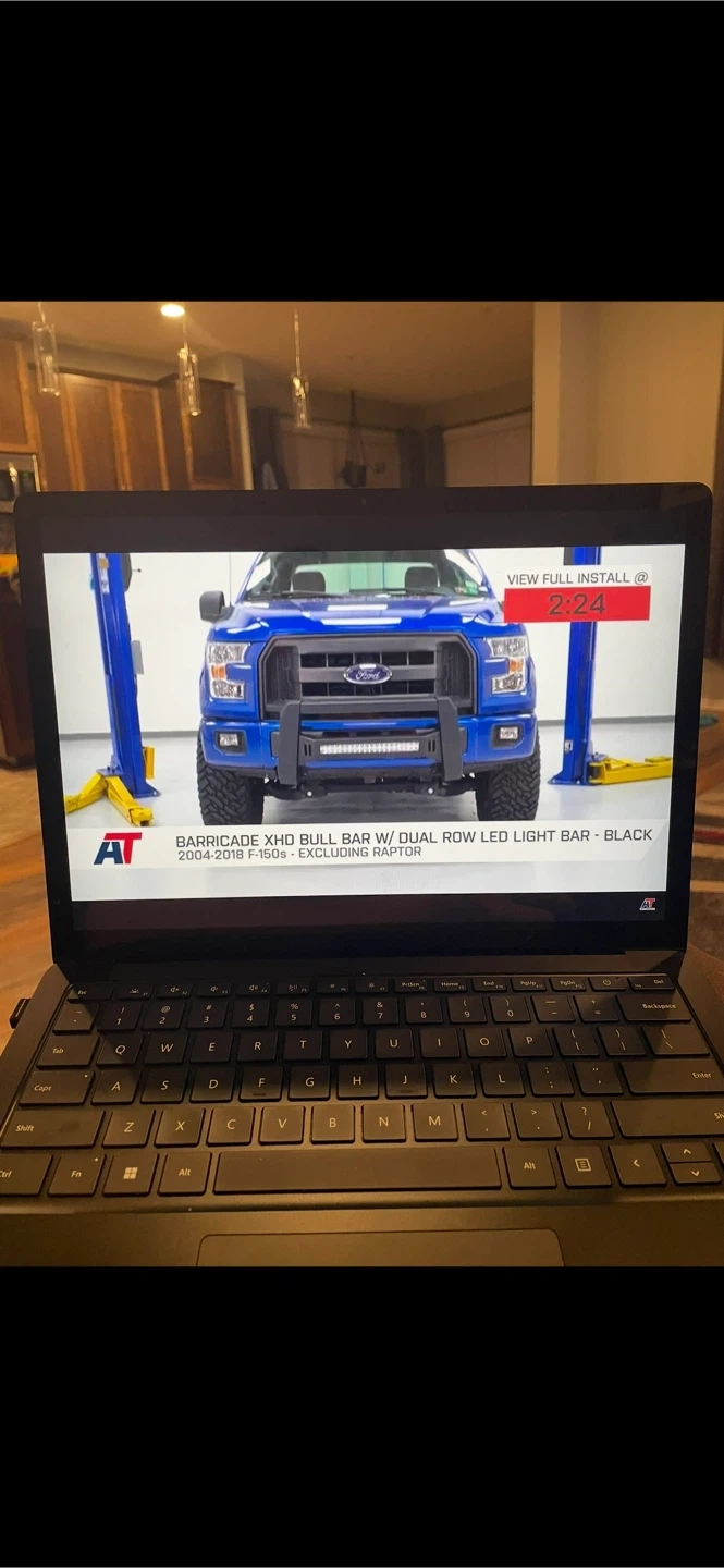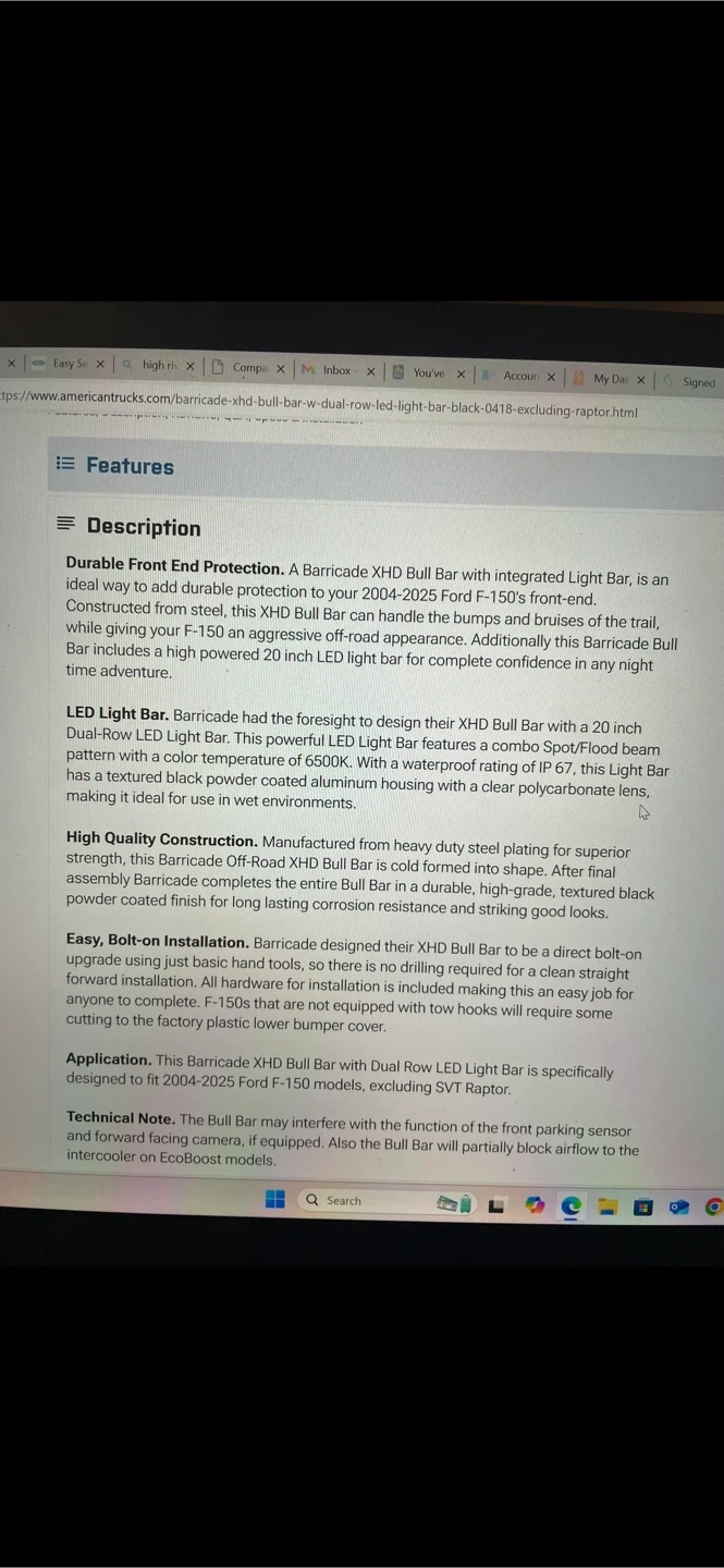 This Barricade XHD Bull Bar offers durable front-end protection and includes an integrated 20-inch dual-row LED light bar. It's constructed from heavy-duty steel with a textured black powder-coat finish for corrosion resistance. Designed for easy installation on 2004-2025 F-150 models, excluding Raptor.