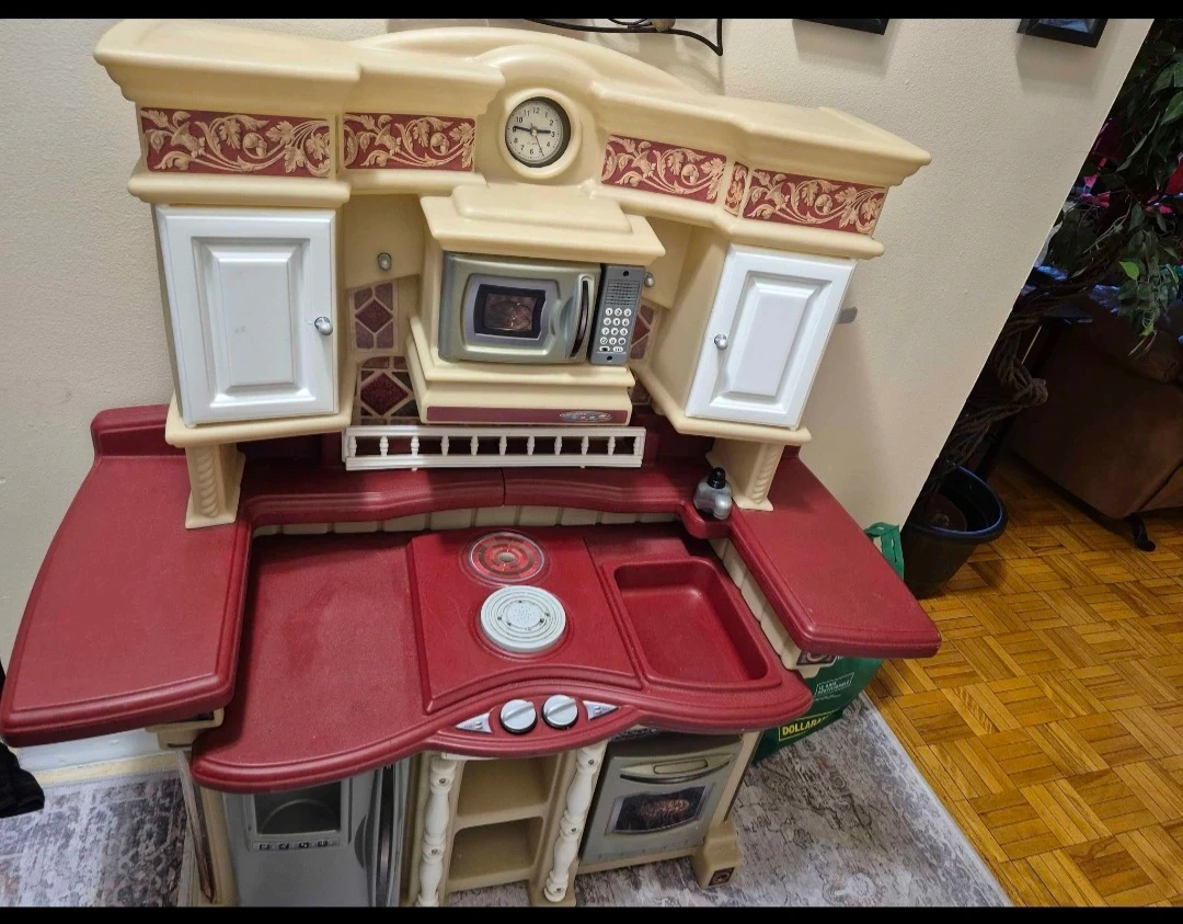 This is a Step2 children's play kitchen. It has a stove top with knobs, oven, microwave, and sink. The kitchen also features decorative cabinetry and a clock. I'm asking $50. It's from a smoke freak on pickup is in welland