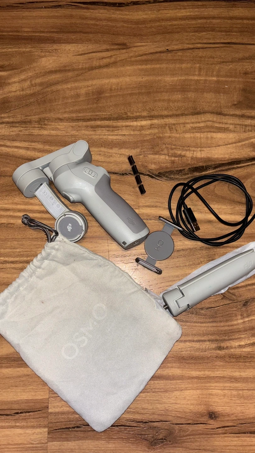 This is a DJI OSMO Mobile 6 smartphone gimbal, great for stabilizing your phone for video recording. It's lightweight and portable. Includes original pouch and charging cable.