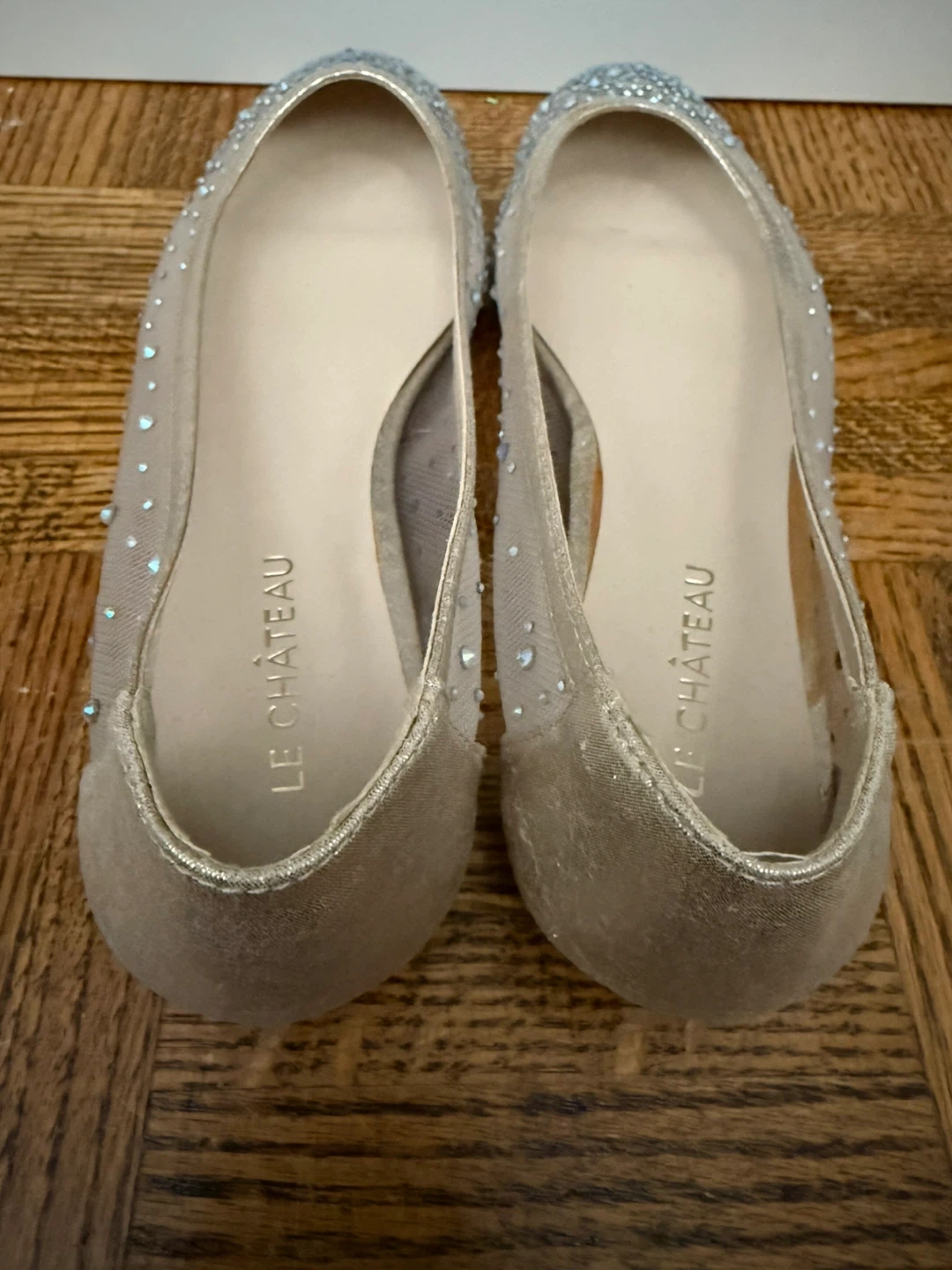 Sparkly Le Château ballet flats. These shoes are covered in rhinestones and feature a delicate mesh overlay. They have a gold-toned trim around the opening.