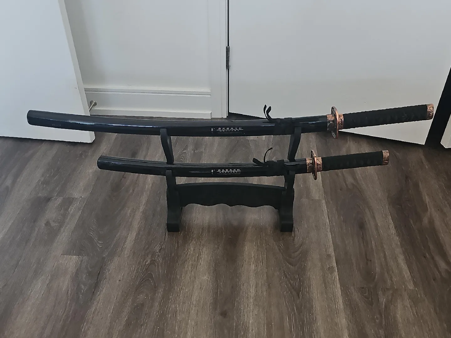 Selling a decorative katana sword set, complete with a stand! These swords are perfect for display and would make a great addition to any collection or room decor. They are in great condition and ready for a new home!