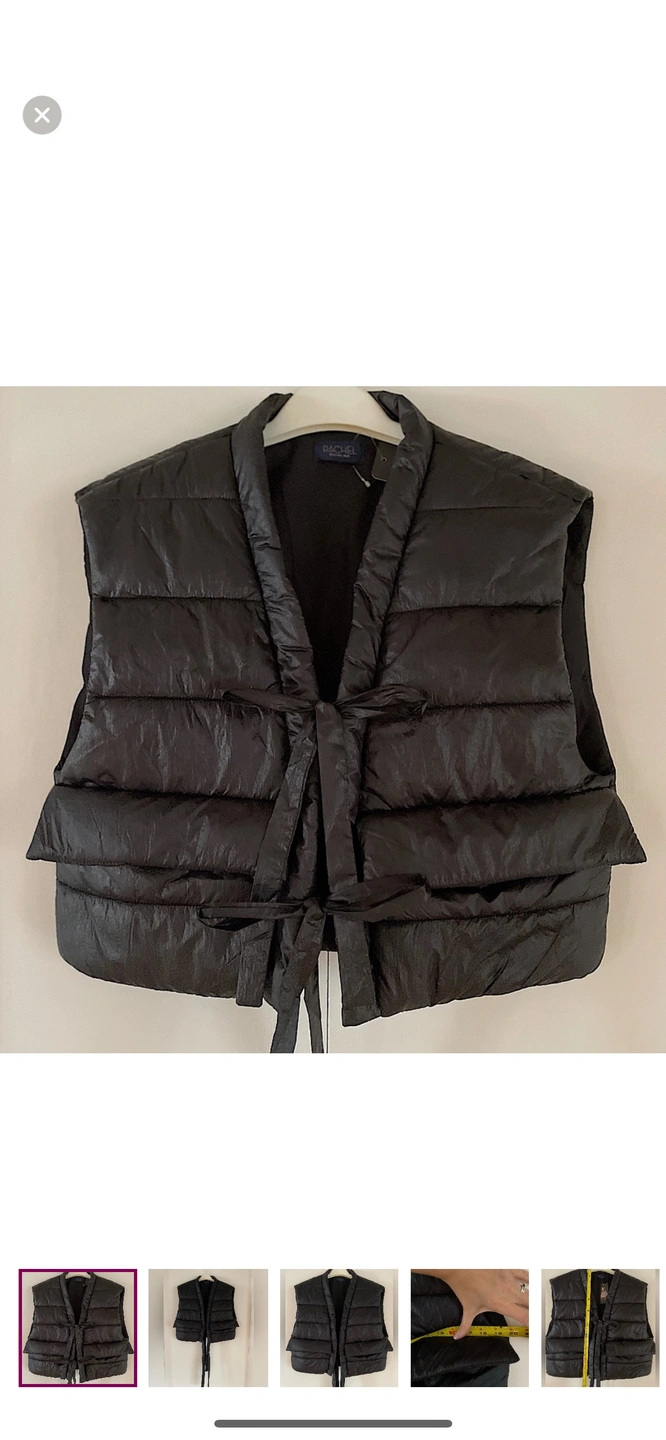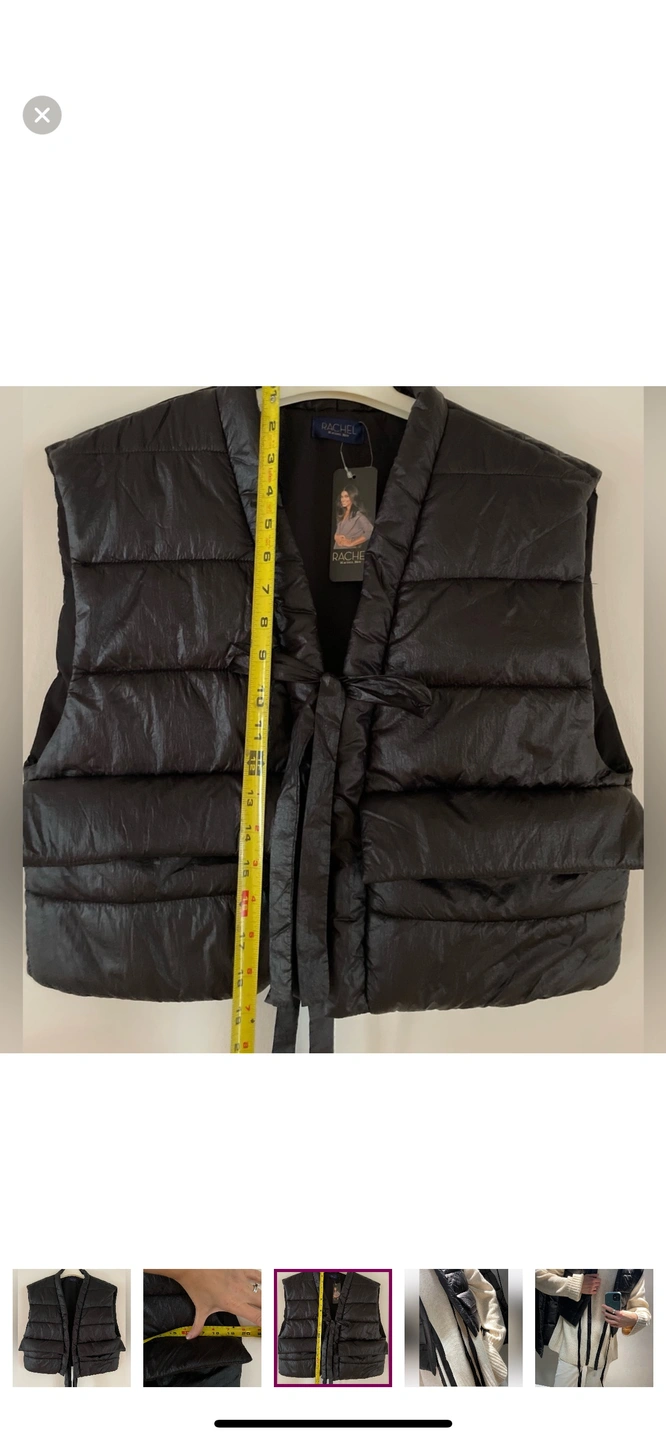 Size: US M Regular $80 RACHEL Rachel Roy NWT. Never worn. Has a boxy yet super flattering crop fit (it's 19" long x 19" pit to pit). Black material is a bit shiny. Vest can be worn open untied or tied! This vest is a great way to add a bit of style to your winter wardrobe. It is a cropped style with a tie at the front. With 2 big pockets