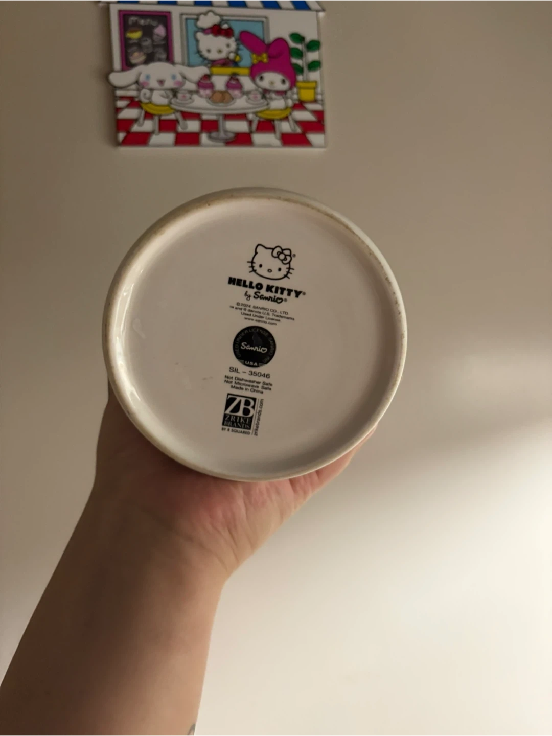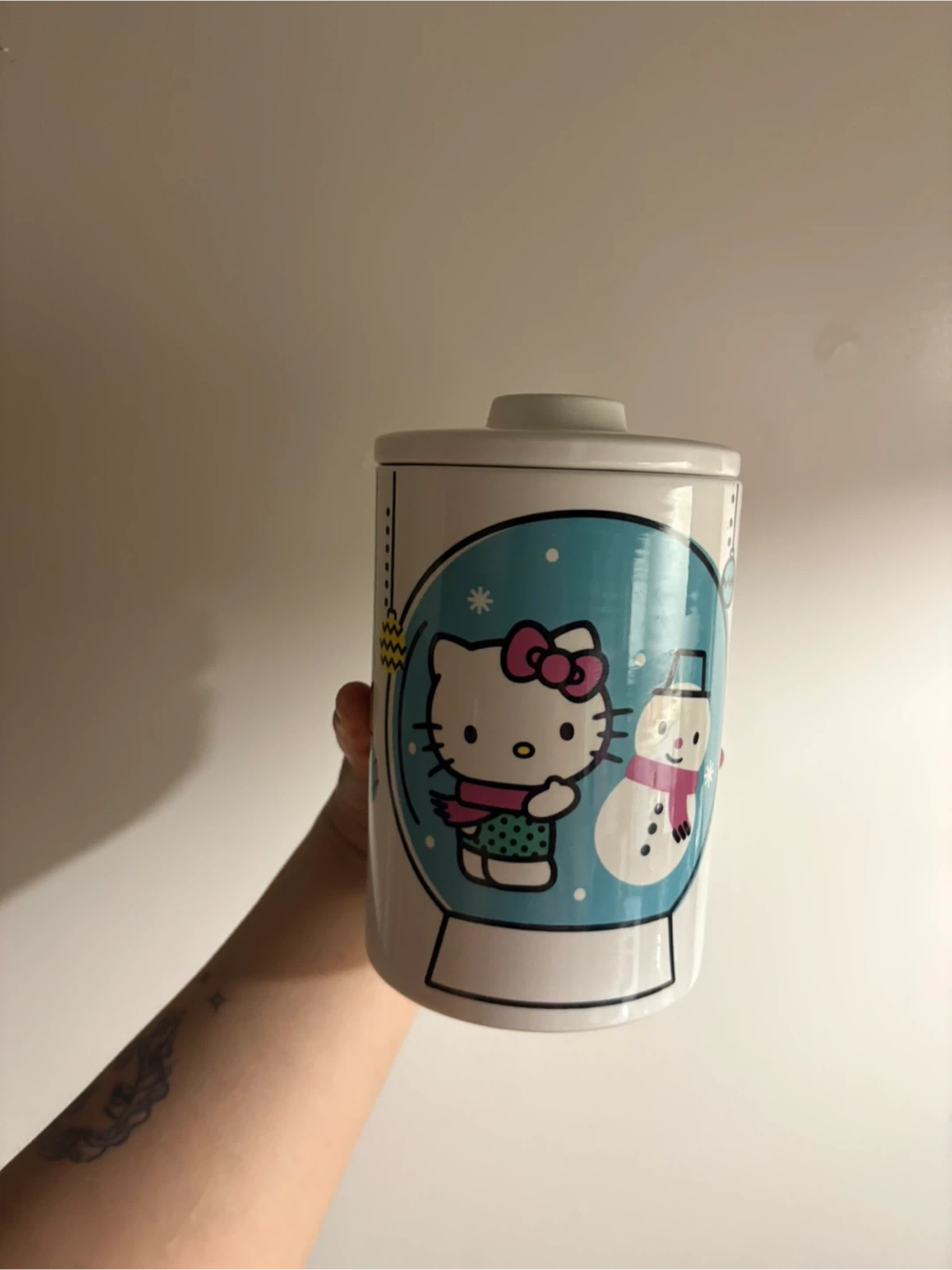 Cute Hello Kitty canister featuring a snow globe design with Hello Kitty and a snowman. It's made of ceramic and has a lid. Perfect for storing small items or as a cute decoration!