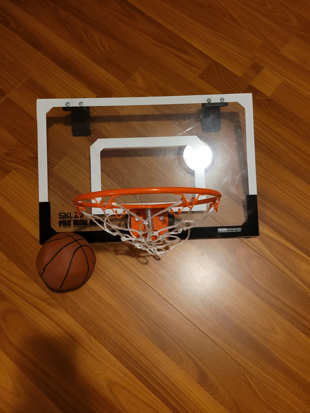 This is a SKLZ Pro Mini Hoop basketball set. It includes the backboard, rim, net, and a small basketball. The backboard is clear with a white frame and an orange rim.