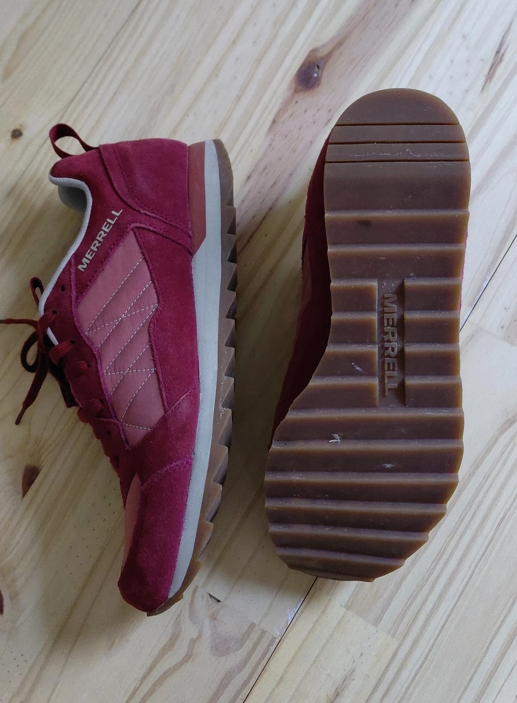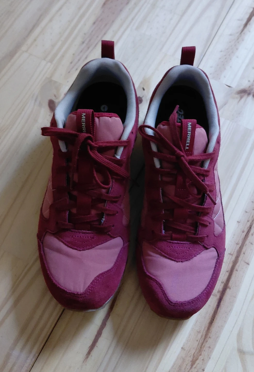 Selling a pair of Merrell sneakers in a lovely burgundy colour! They're in great shape and ready for someone new to enjoy. Size 8.