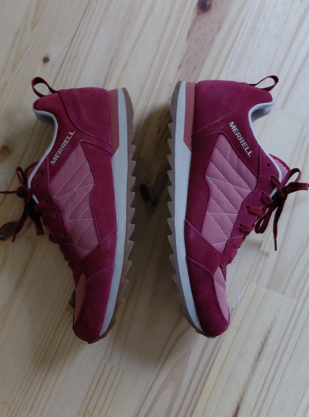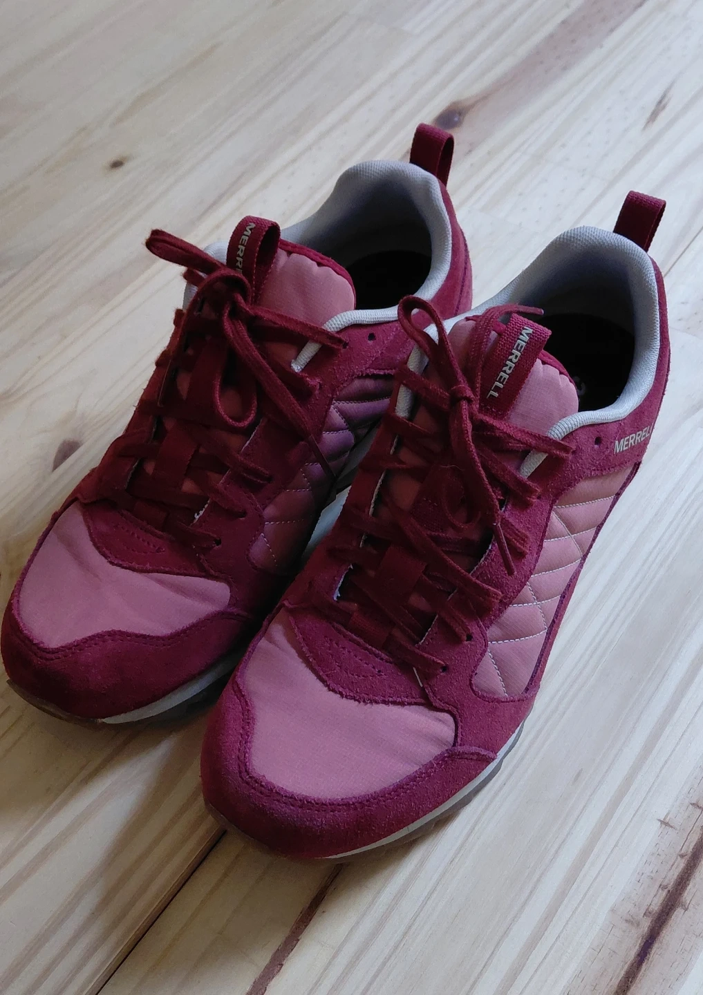 Selling a pair of Merrell sneakers in a lovely burgundy colour! They're in great shape and ready for someone new to enjoy. Size 8.