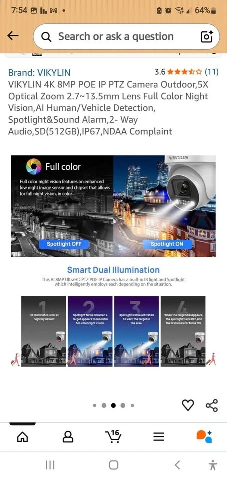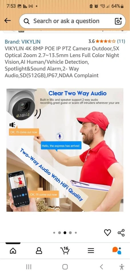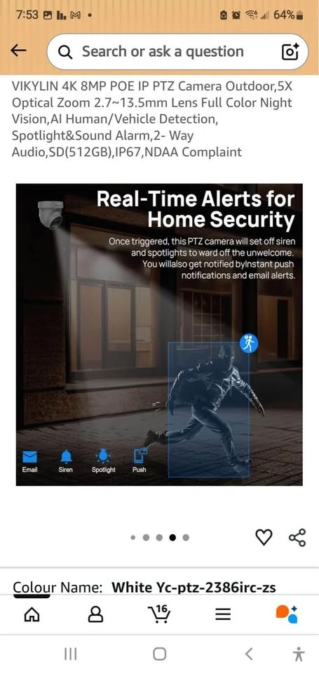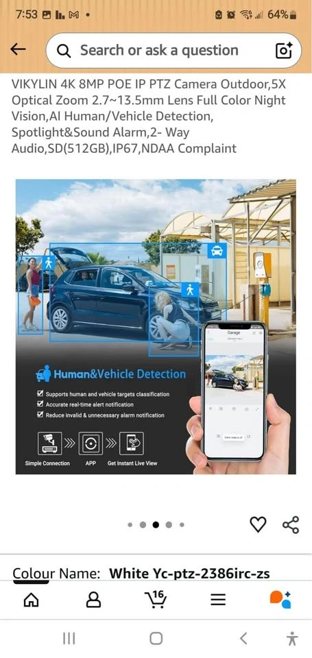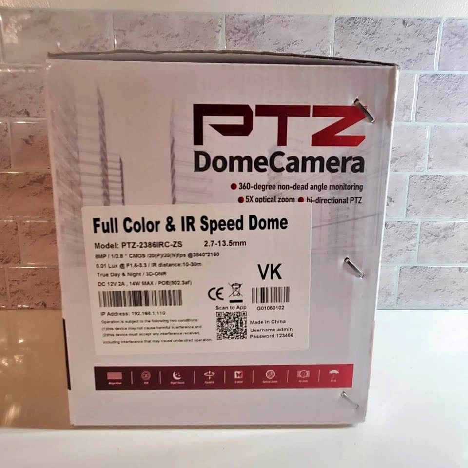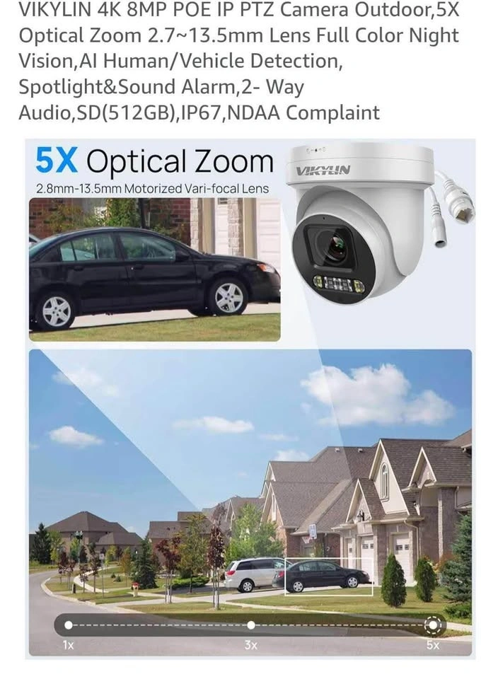 VIKYLIN 4K 8MP POE IP PTZ Camera for outdoor use, featuring a 5X optical zoom with a 2.7~13.5mm lens, full colour night vision, AI human/vehicle detection, spotlight and sound alarm, 2-way audio, SD(512GB), NDAA compliant. Key features include: 8MP high-resolution video, 5X optical zoom, full colour night vision, AI-powered detection, two-way audio. Feel free to message if you have any questions!