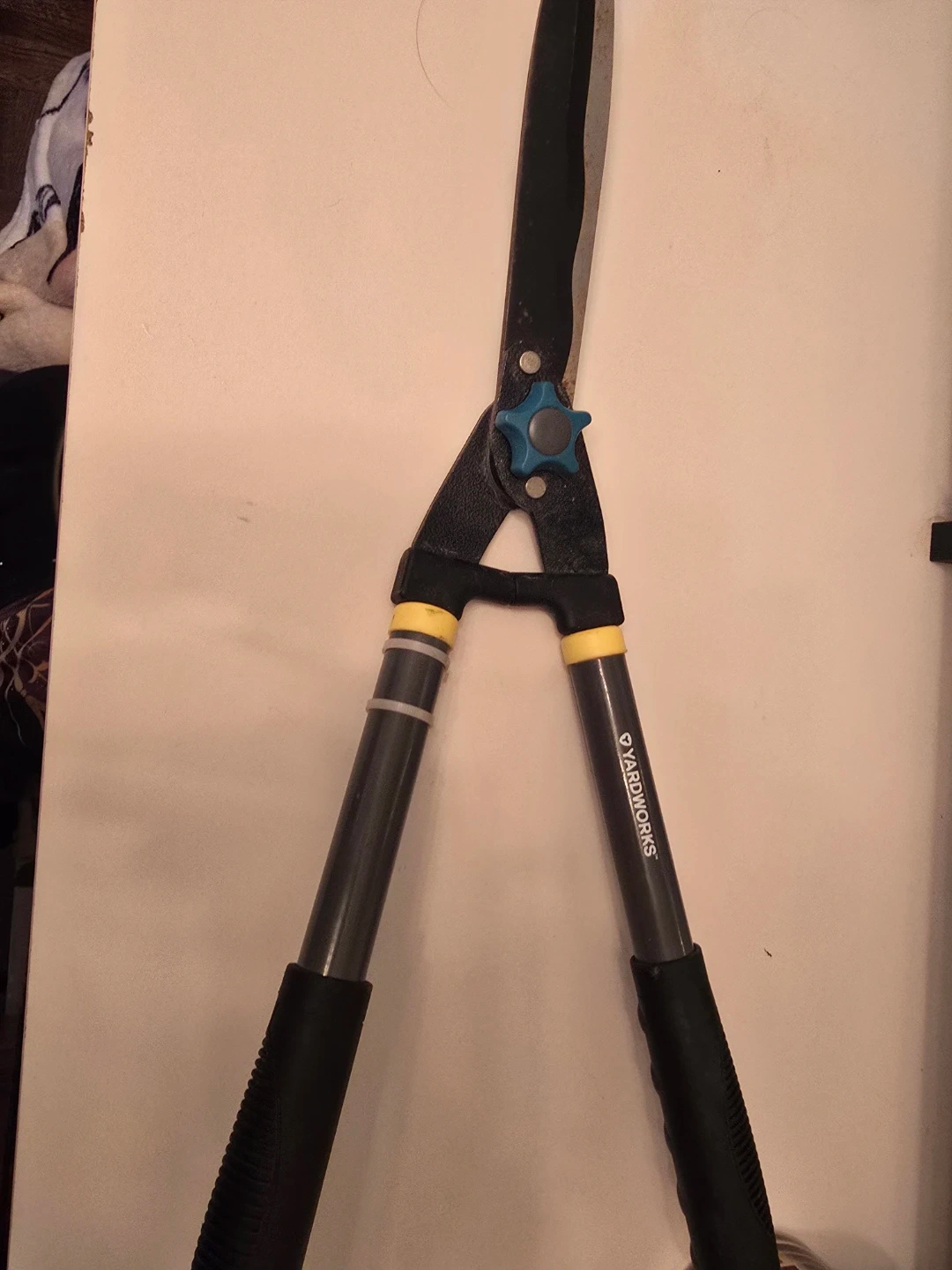 Yardworks hedge trimmers with comfortable black grips. Features a blue adjustment knob for blade tension. Great for general garden maintenance!