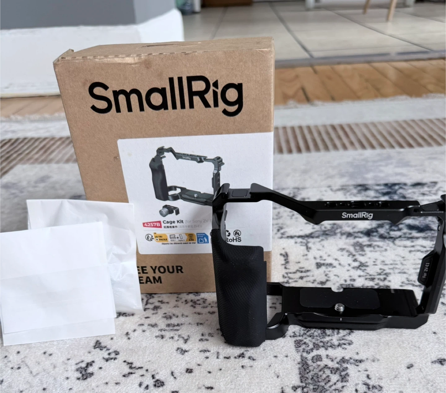 This is a SmallRig 4257B cage kit designed for the Sony ZV-E1 camera. It includes the cage and mounting hardware. The kit is made of metal for durability.