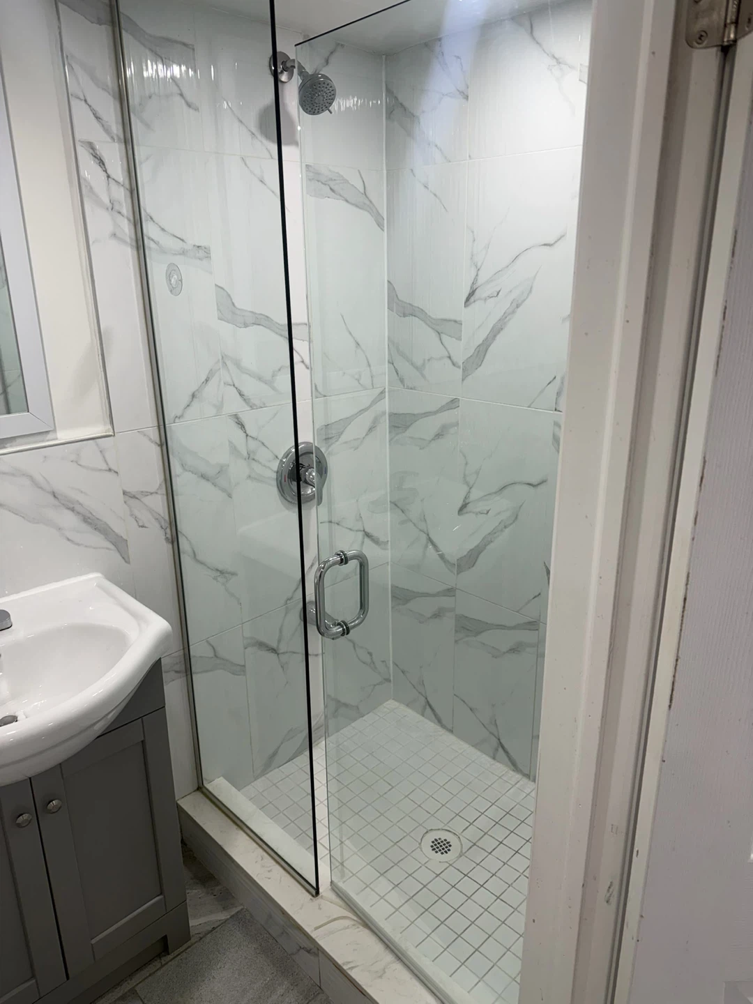 Compact kitchen area with stainless steel fridge, microwave, stovetop, and sink. Adjacent bathroom features a toilet, vanity with sink, and a glass-enclosed shower stall. Ideal for a small apartment or guest suite! We’re looking for a couple or student no parking at all