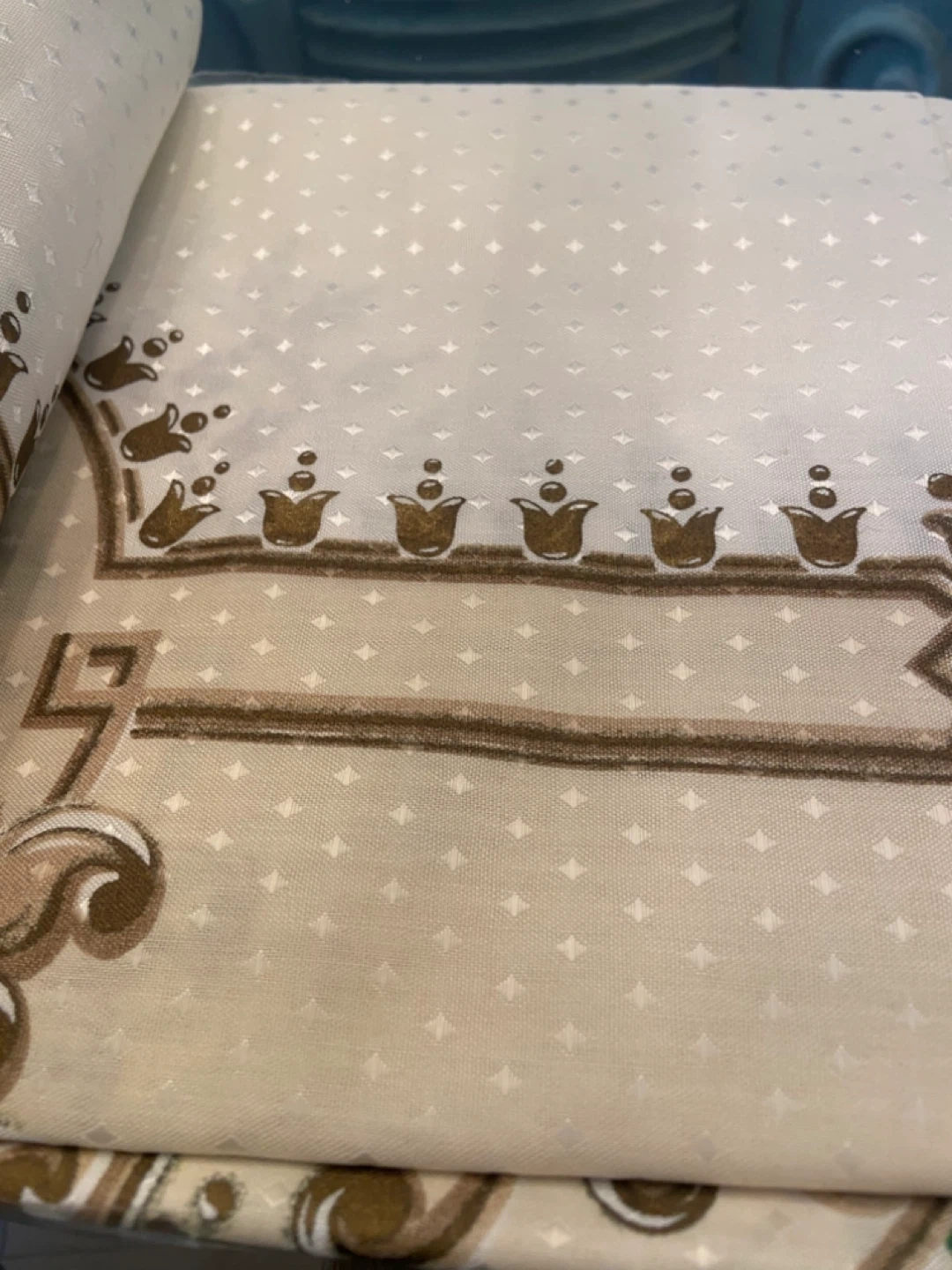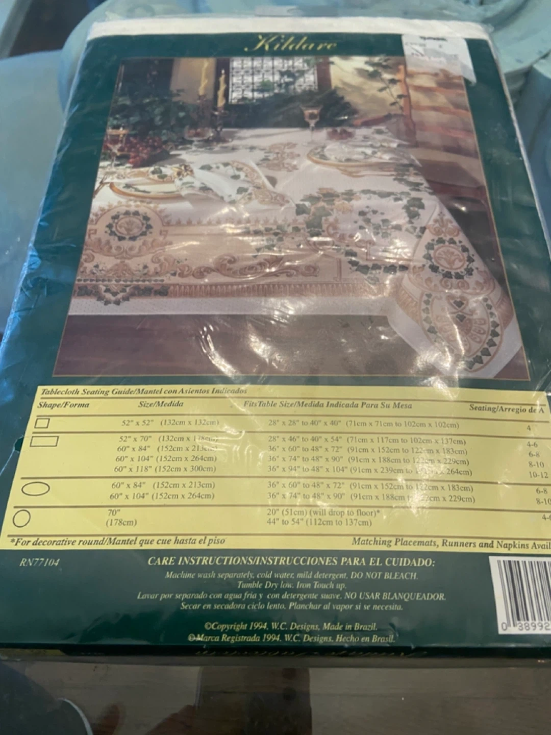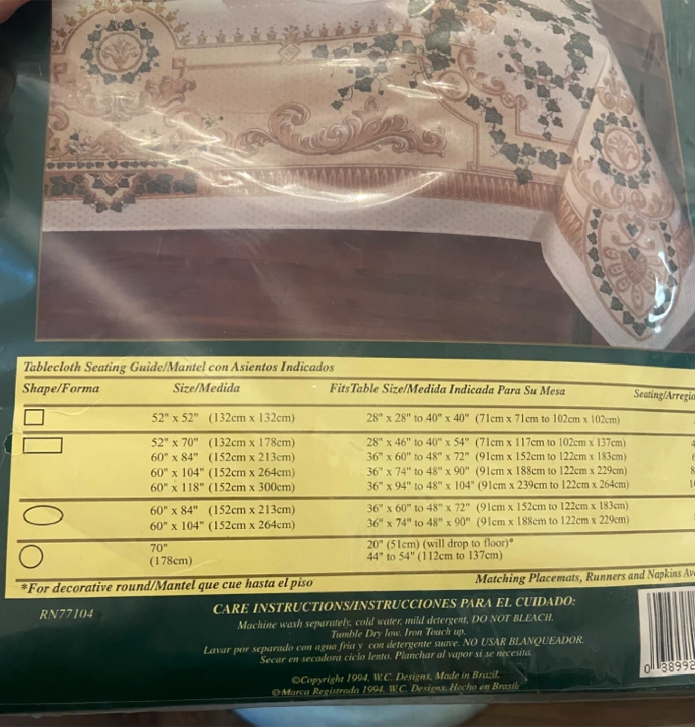 Lovely tablecloth from Wilton Court in the Kildare pattern. It's made of 60% cotton and 40% polyester. This tablecloth measures 60”x 104”