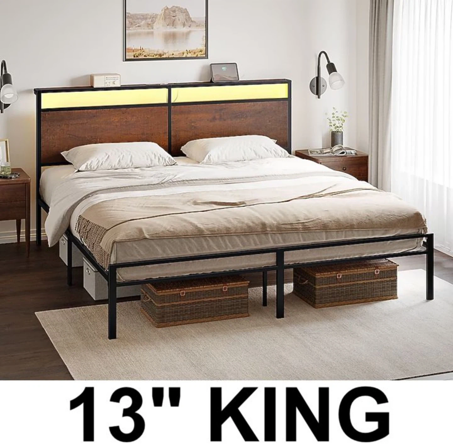 This is a king-size bed frame. It features a wooden headboard and a metal frame. The frame has a 1000 lb capacity and is easy to assemble. Bedding not included.