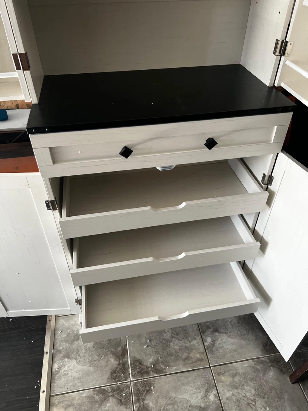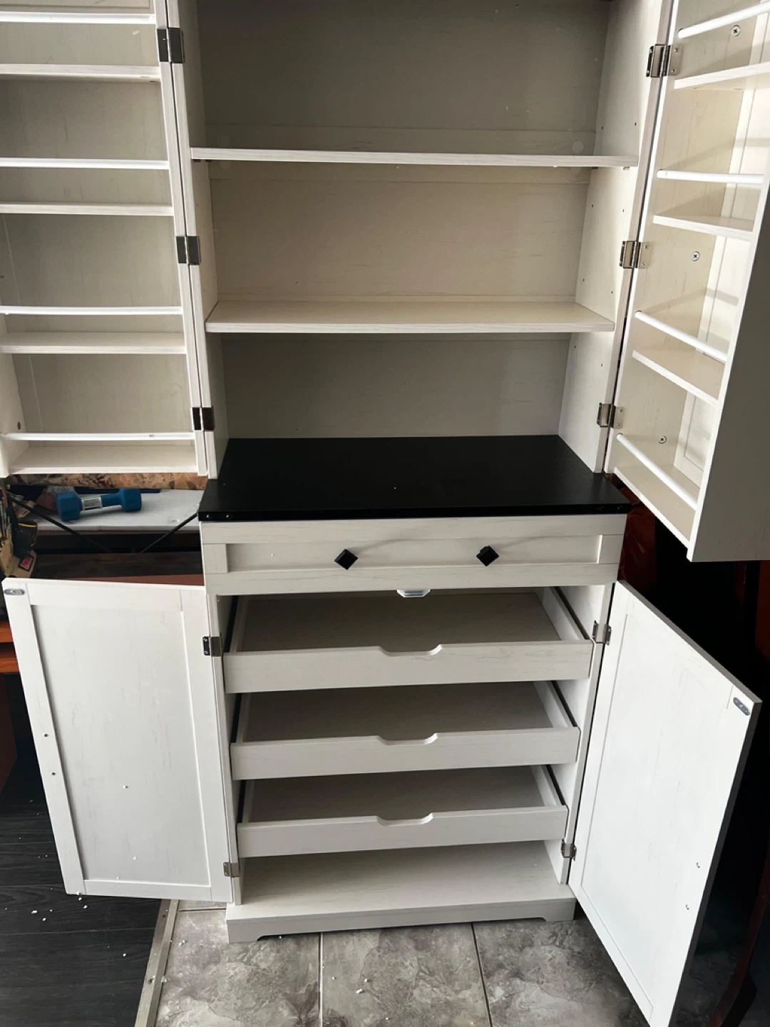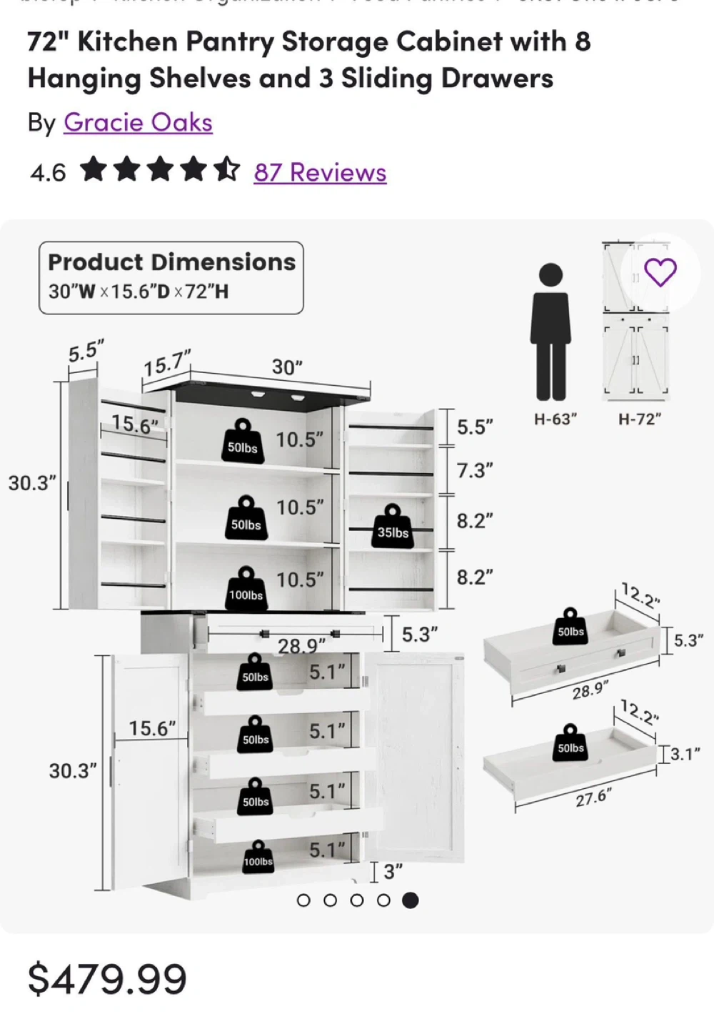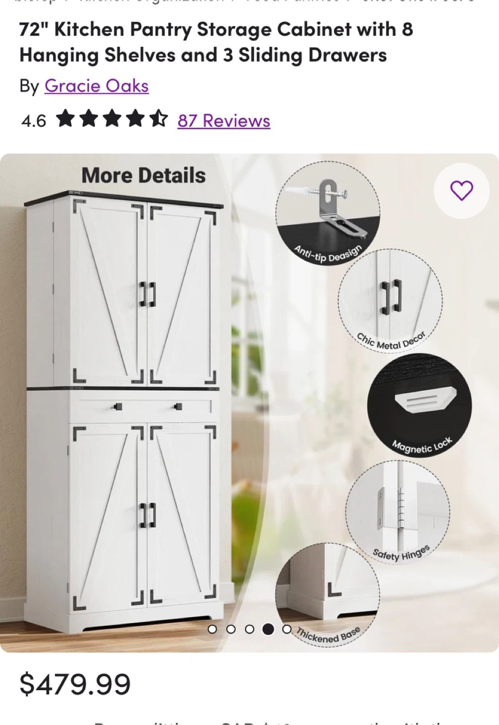 This is a white 72" kitchen pantry storage cabinet. It features 8 door shelves, 2 adjustable shelves, and 3 sliding drawers. The cabinet has a chic metal decor and magnetic locks. Perfect for organizing your kitchen! It’s brand new