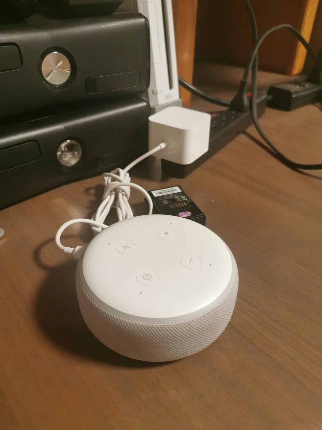 It's an Amazon Echo Dot, 3rd generation, in white. This smart speaker connects to Wi-Fi for voice control. It has a fabric base and touch-sensitive buttons on top.