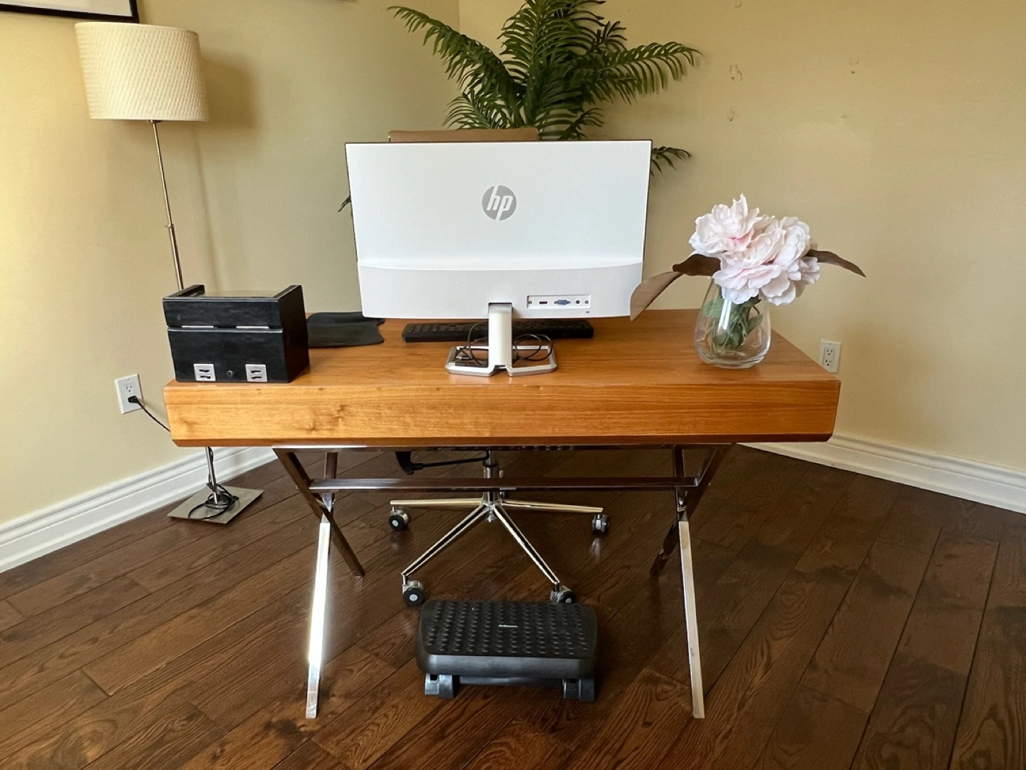 Stylish wooden desk. Two drawers. Chrome legs. Excellent condition. Bought for $550+tax, selling for half price.
