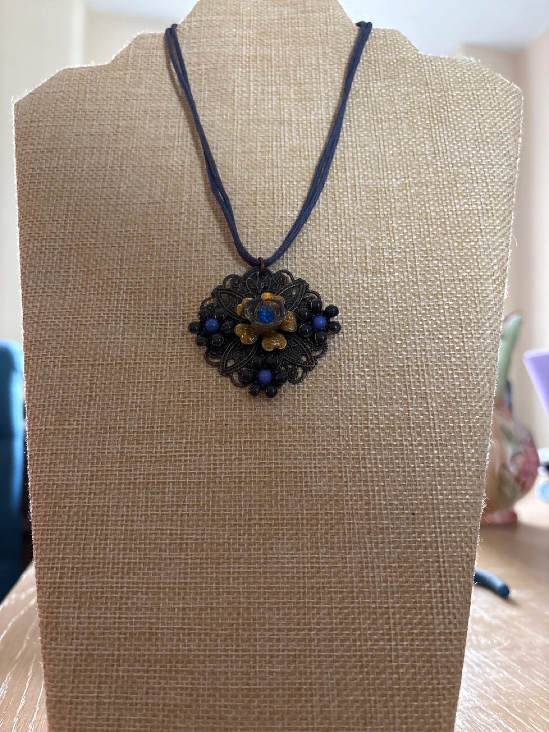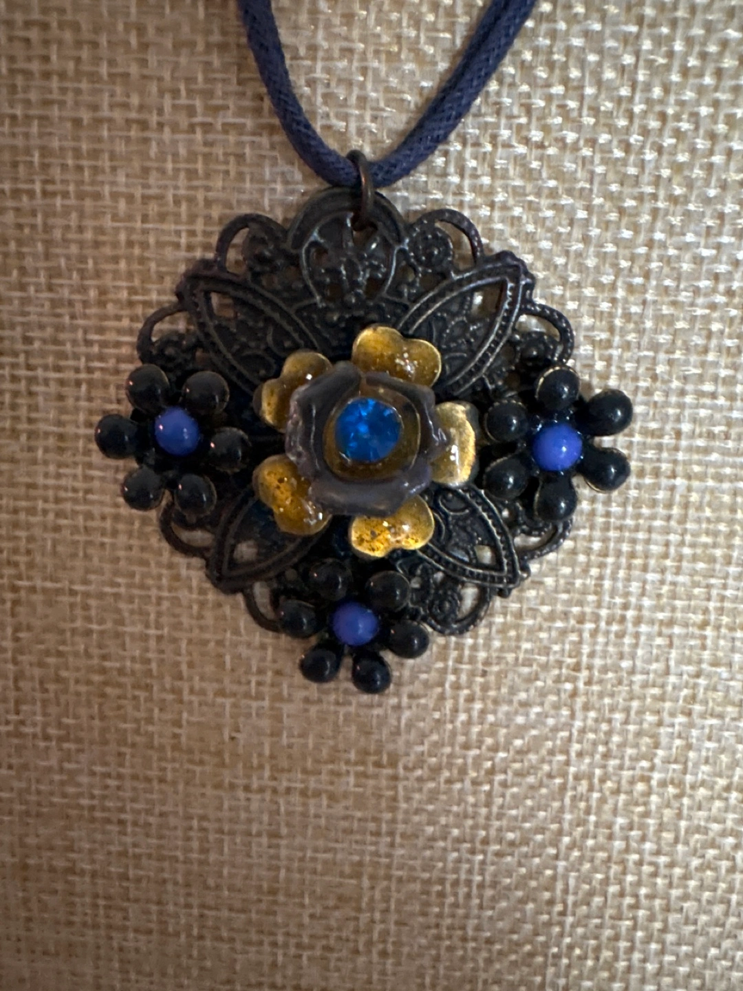 Beautiful necklace features an ornate filigree pendant. Pendant adorned with blue and black stones. Dark cord necklace. Great statement piece.