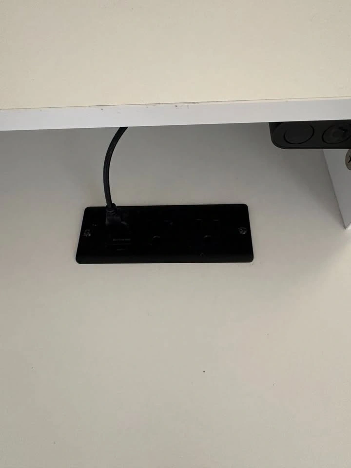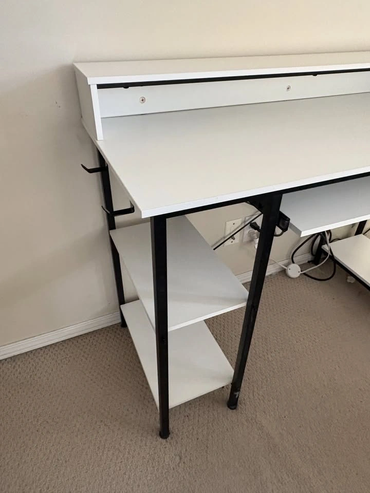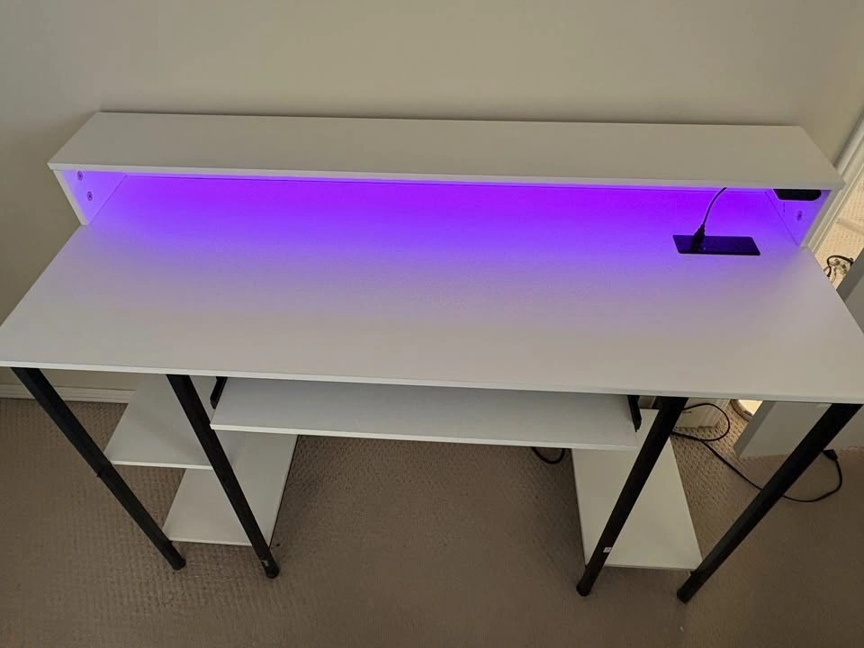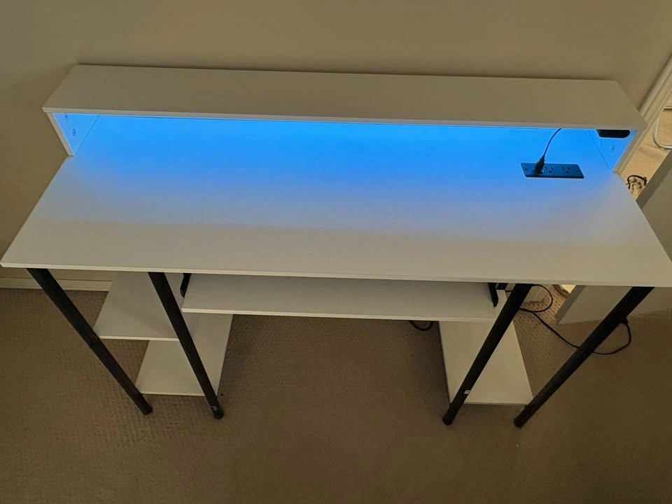 Selling a desk and office chair (no arms) in very good condition. The desk was bought new and is very sturdy, perfect for working from home or studying. The chair is comfortable and in good condition. This home office desk has a built-in power strip with 2AC+2USB+1TypeC. The desk also has 7 color LED strips for lighting effects. The desktop is 18.5"D x 47.2"W. Selling because I’m moving. Can be sold together or separately. Desk: $80, Chair: $30, Both together: $90. Pickup in Beltline.