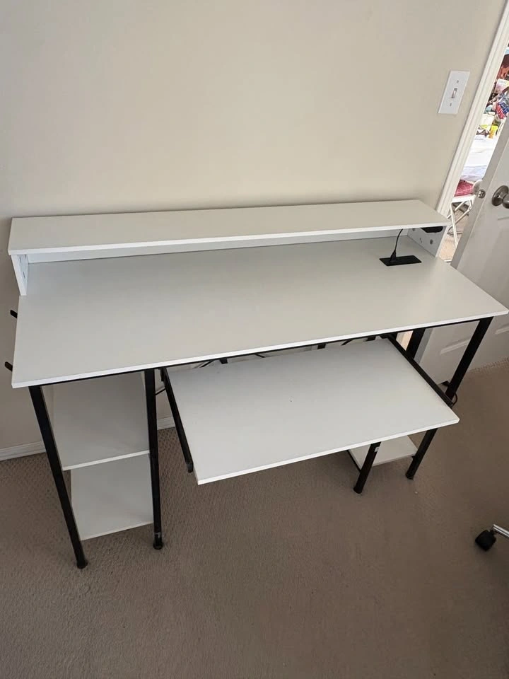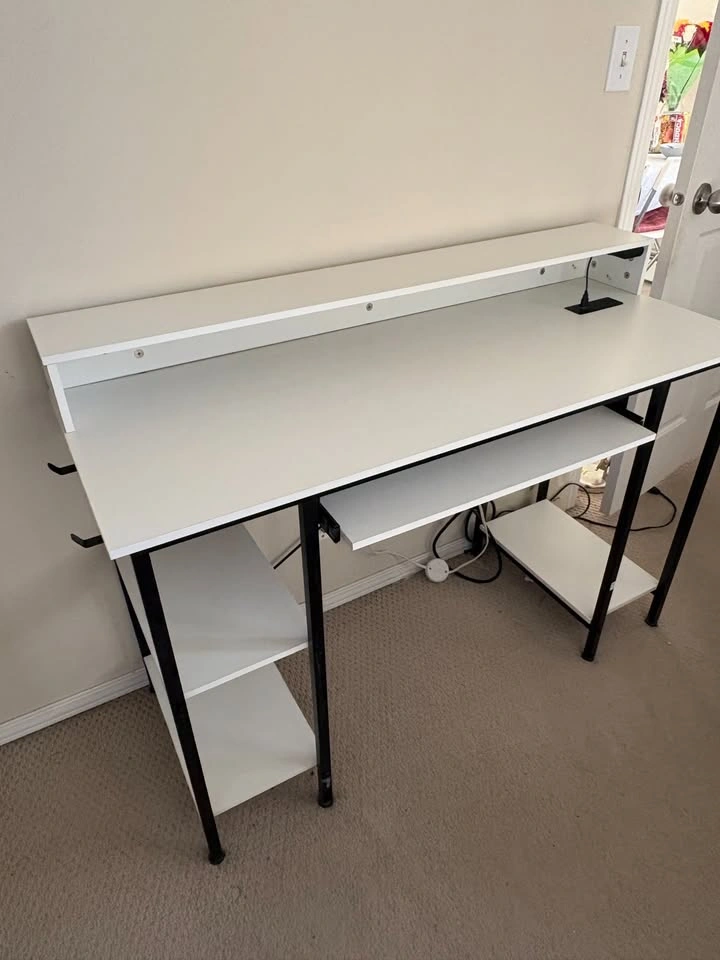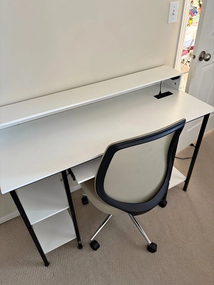Selling a desk and office chair (no arms) in very good condition. The desk was bought new and is very sturdy, perfect for working from home or studying. The chair is comfortable and in good condition. This home office desk has a built-in power strip with 2AC+2USB+1TypeC. The desk also has 7 color LED strips for lighting effects. The desktop is 18.5"D x 47.2"W. Selling because I’m moving. Can be sold together or separately. Desk: $80, Chair: $30, Both together: $90. Pickup in Beltline.