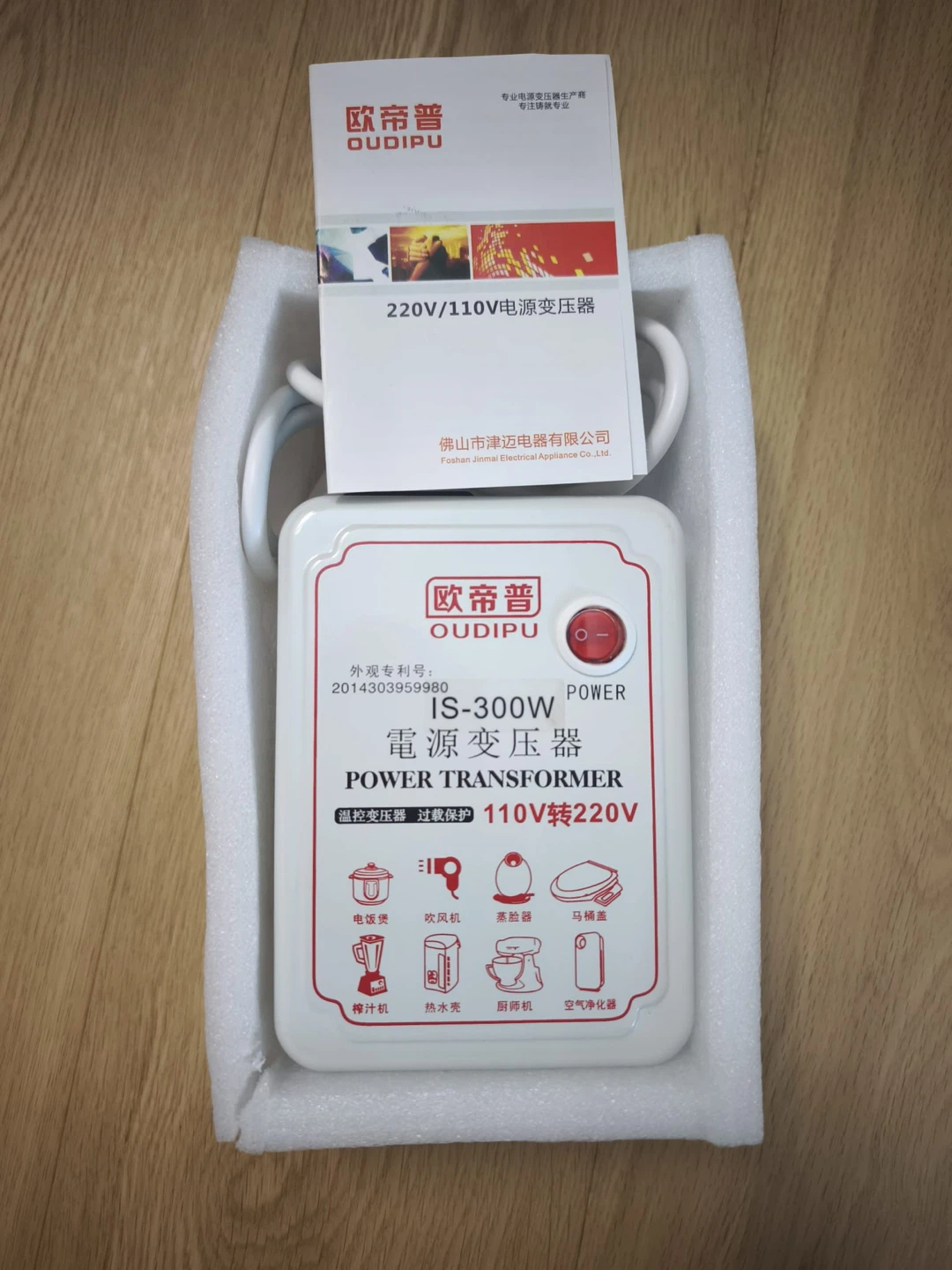 This Oudipu power transformer converts 220V to 110V. It's rated for 300W. Perfect for using 110V appliances in 220V regions.