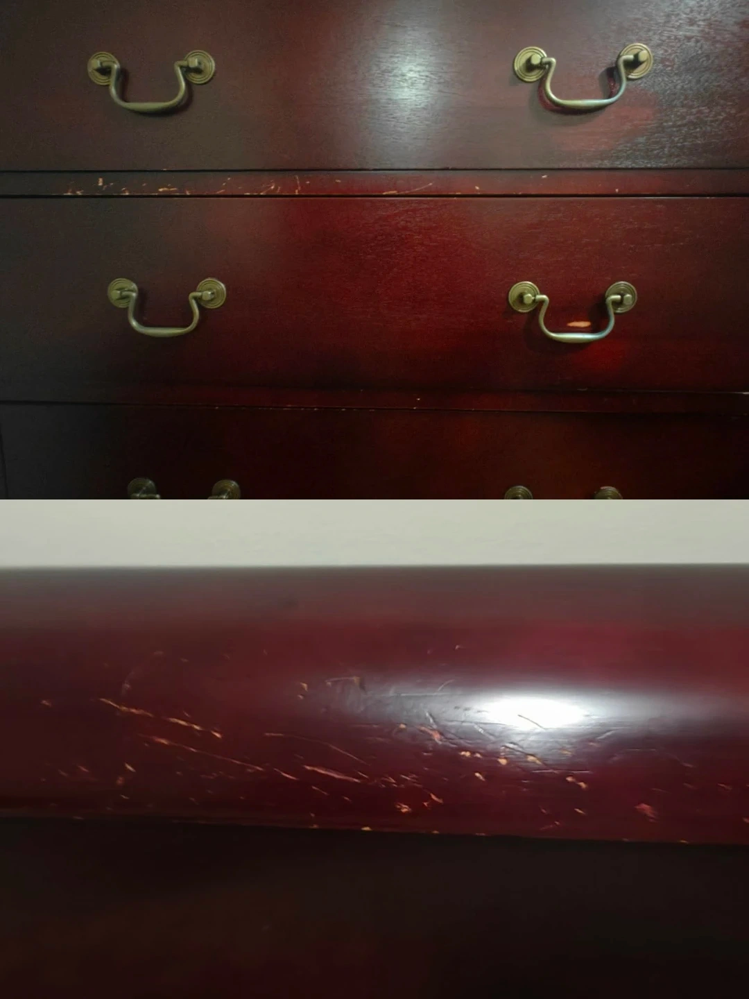 Dark wood bedroom furniture set including a dresser with mirror, two nightstands, and a chest of drawers. The 5th drawer on the chest is functional but difficult to open. Some minor scuffs visible on the top of headboard and one nightstand otherwise fair/good condition.