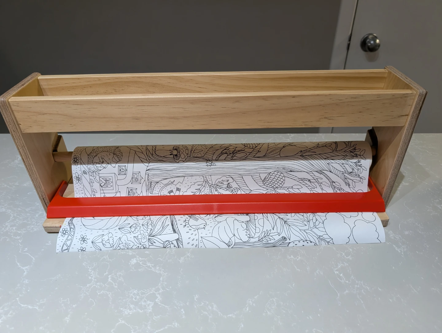 Selling a wooden art paper roll dispenser with a red cutter bar. It's perfect for kids' art projects and keeping things organized! It's in great shape and ready for a new home.