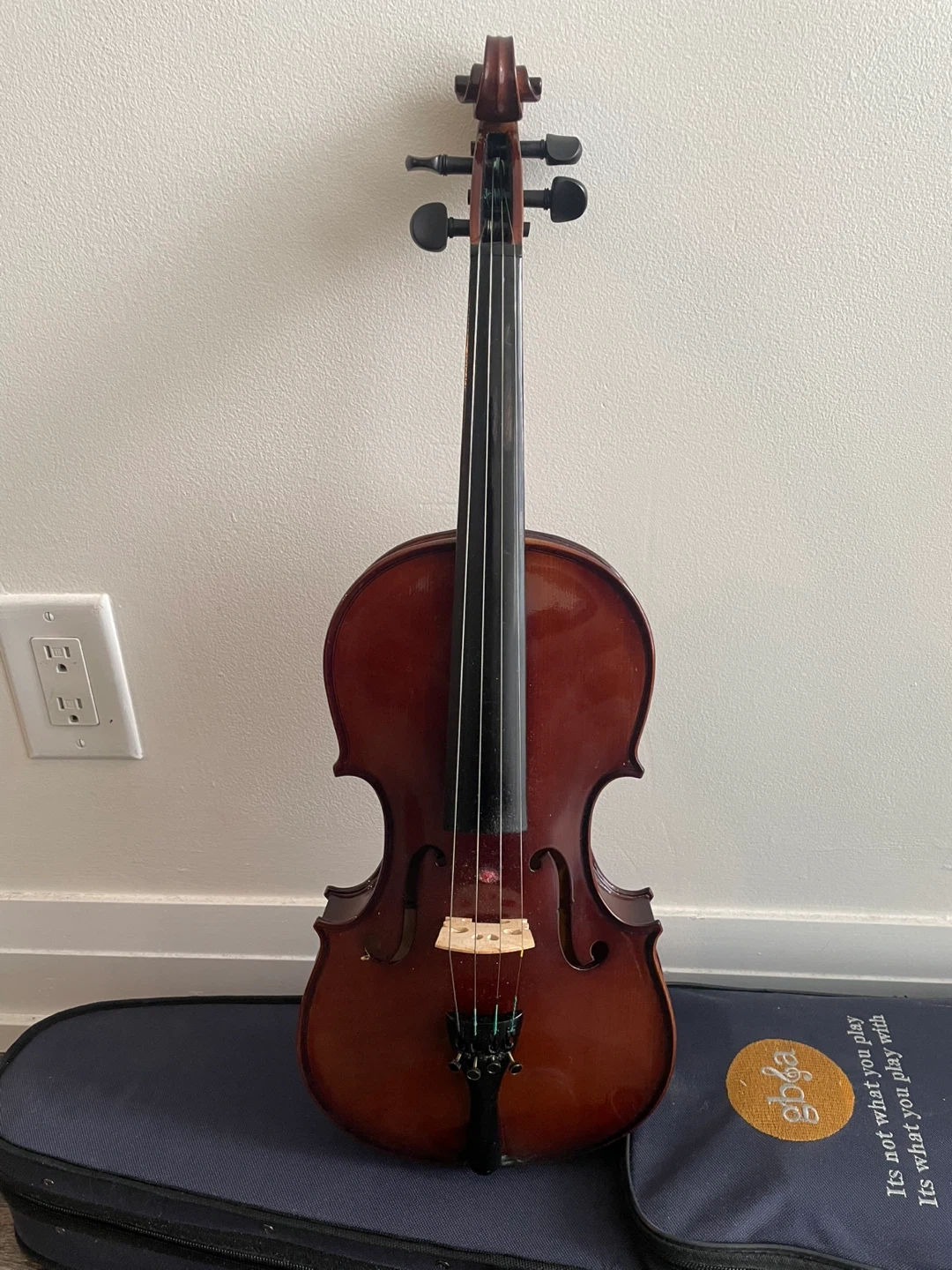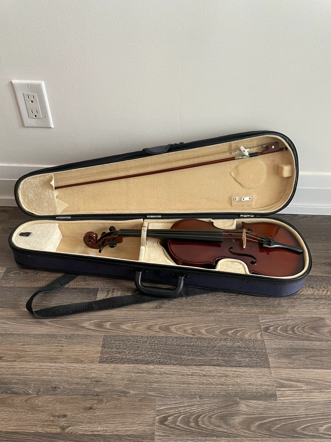 A Gliga violin in a dark blue case, including a bow. It's a great instrument for beginners learning to play. The violin has a warm, rich tone.