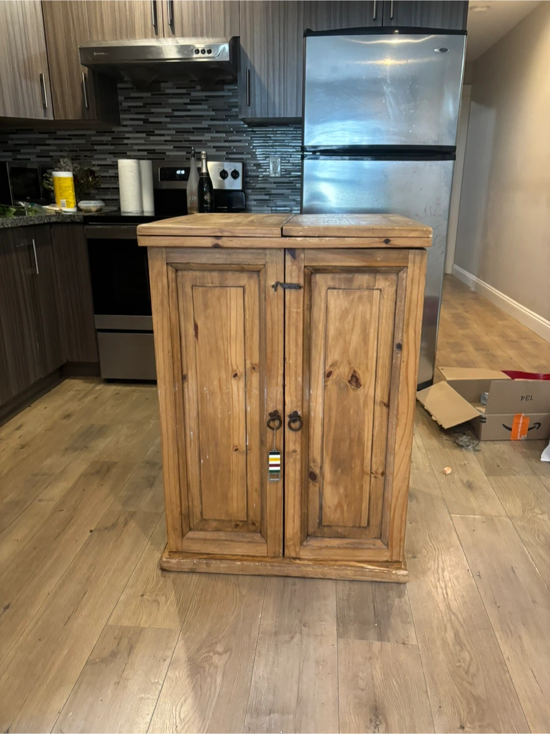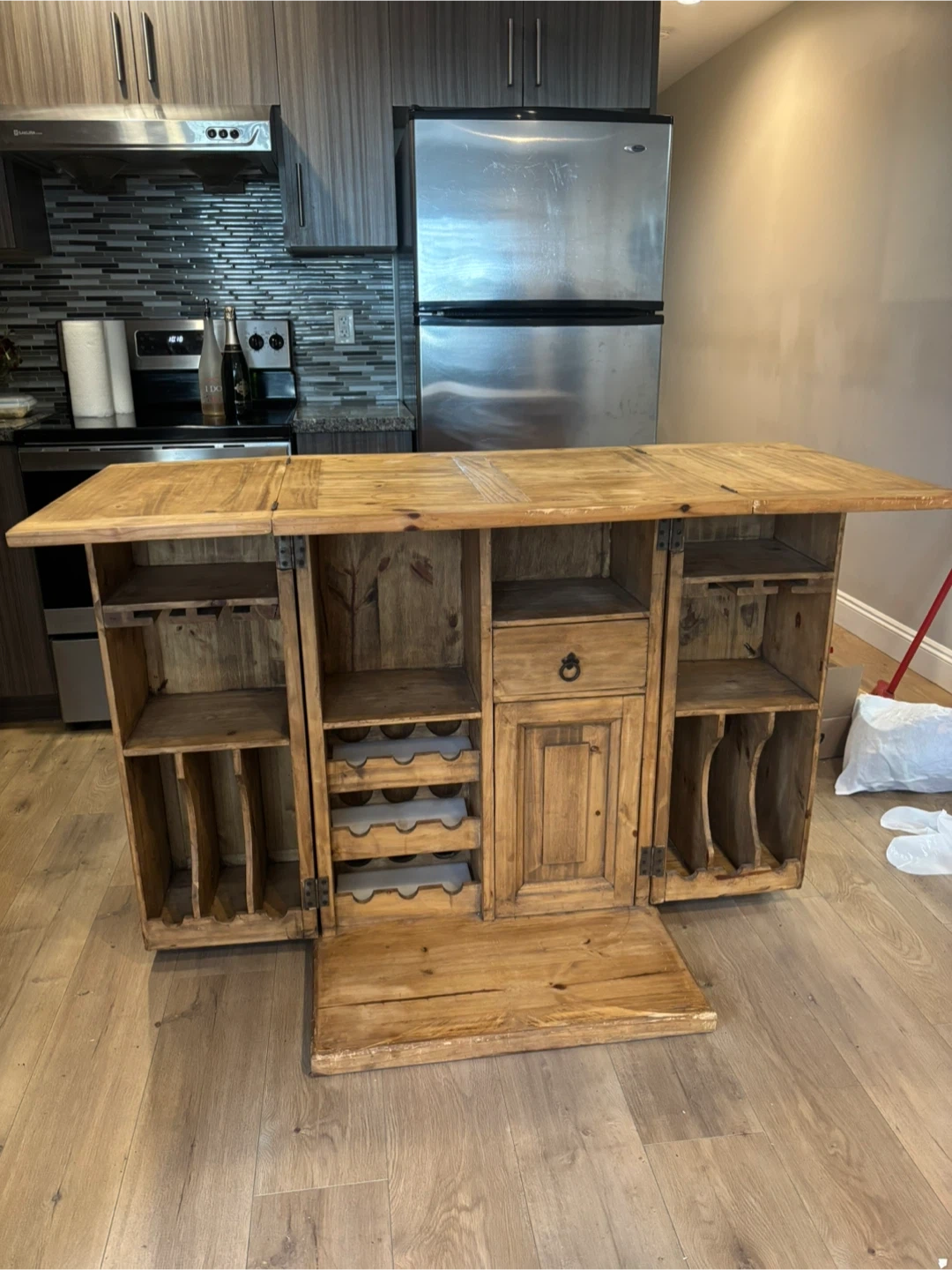This rustic wooden bar cabinet features a fold-out design for extra surface space. It includes shelving for bottles and glassware, plus a small drawer. It's perfect for storing drinks and entertaining!