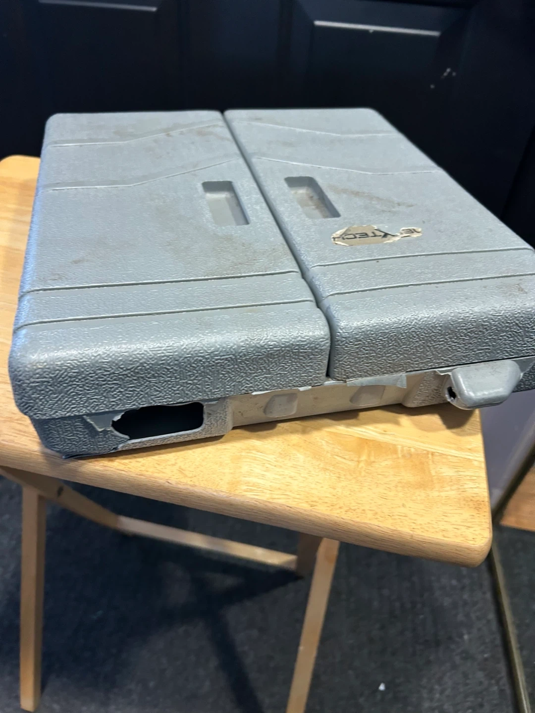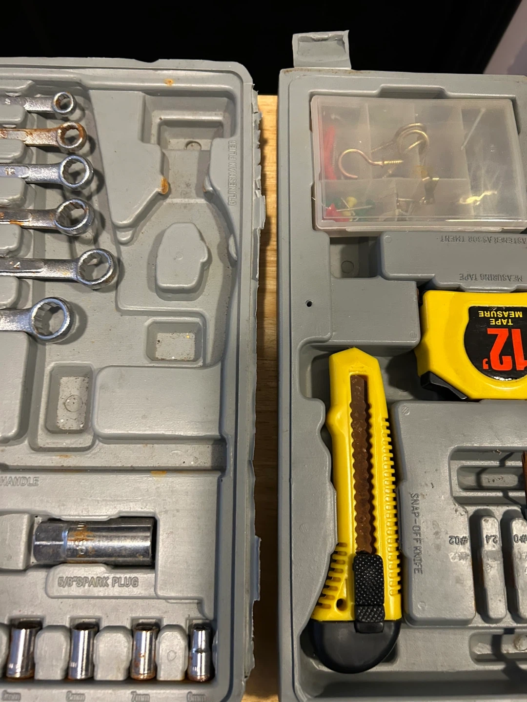 Handy tool kit for home projects. Has wrenches, sockets, screwdrivers, tape measure, and utility knife. The case is broken and one of the folding sides is disconnected.