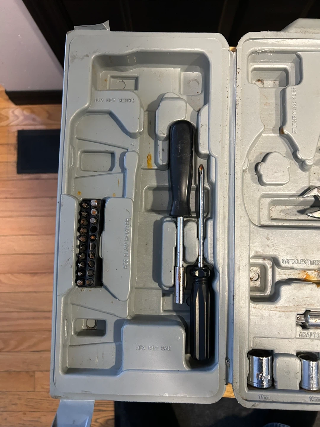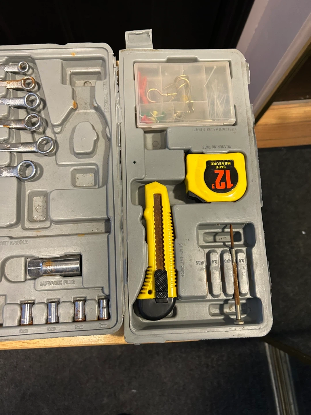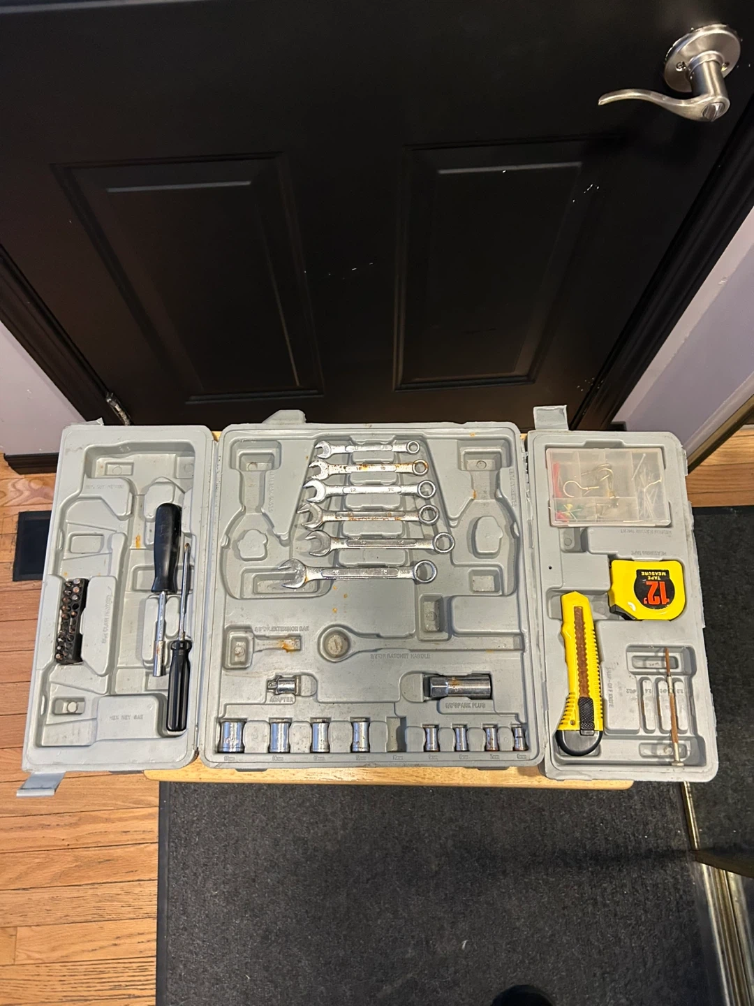 Handy tool kit for home projects. Has wrenches, sockets, screwdrivers, tape measure, and utility knife. The case is broken and one of the folding sides is disconnected.