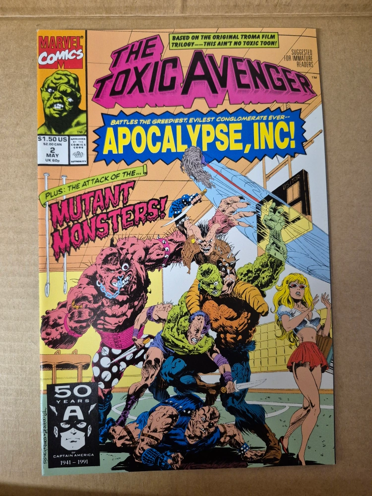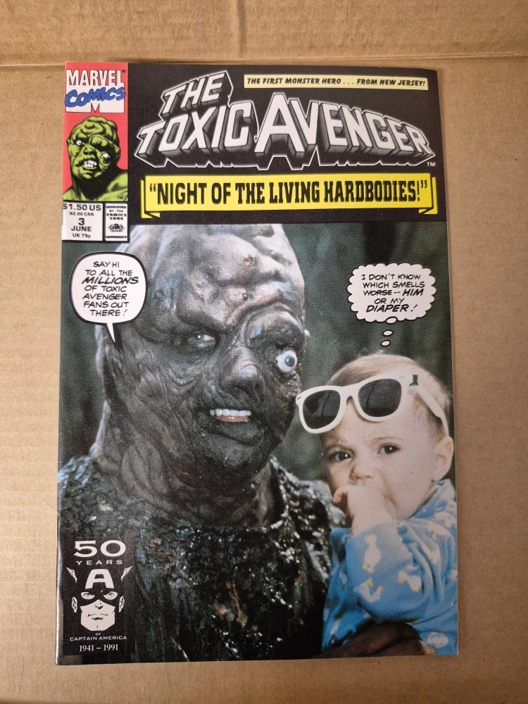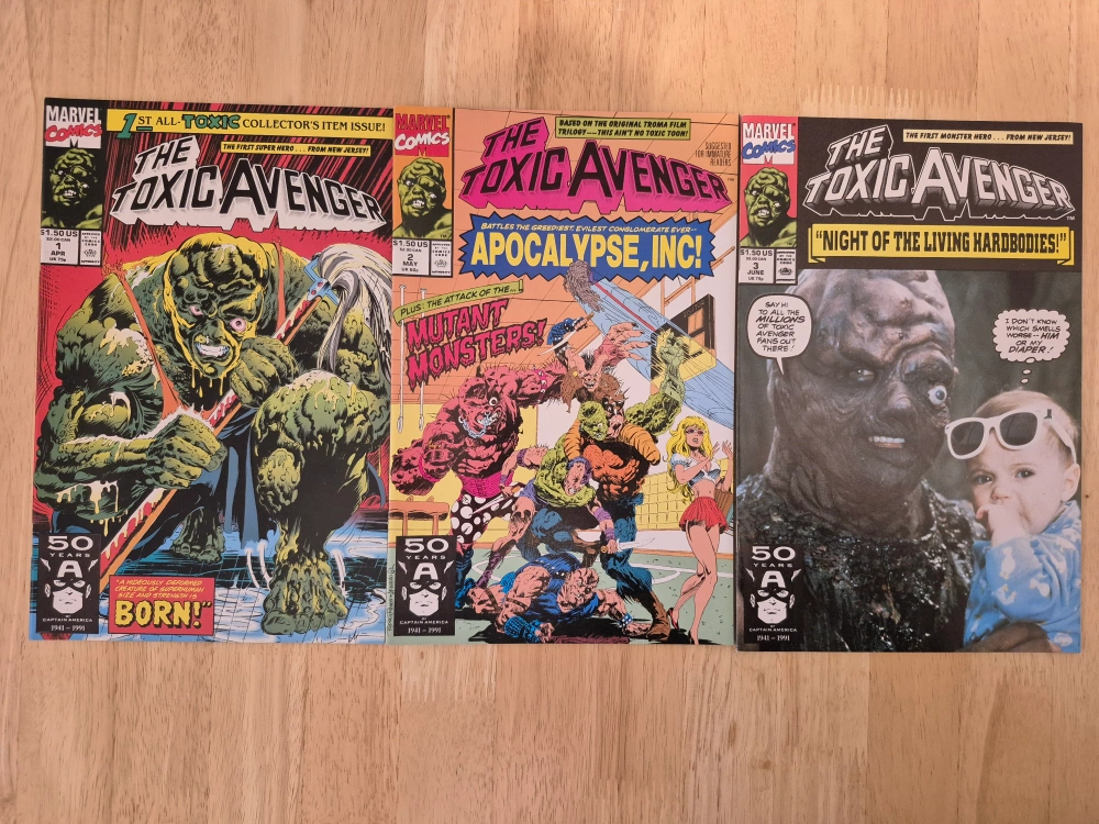 Three collectible Marvel Comics featuring The Toxic Avenger. First issue is a collector's item. Issues include Apocalypse, Inc. and Night of the Living Hardbodies.